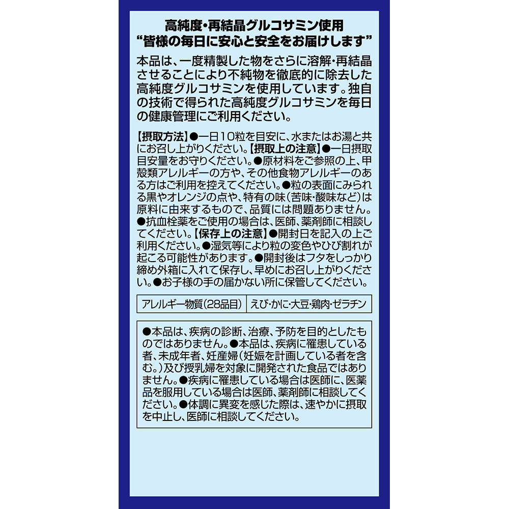 グルコサミン(えび・かに由来)、結晶セルロース、グリセリン脂肪酸エステル、二酸化ケイ素、V.K、V.B6、V.B1、ヒアルロン酸、V.D、葉酸