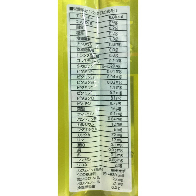 栄養成分表示:1パック(3g)あたり/エネルギー:8.8kcal、たんぱく質:0.9g、脂質:0.2g、糖質:0.2g、食物繊維:1.3g、ナトリウム:0.8mg、飽和脂肪酸:0.0g、トランス脂肪酸:0.0g、コレステロール:0.1mg、β-カロテン:0-1320μg、ビタミンB1:0.01mg、ビタミンB2:0.04mg、ビタミンB6:0.02mg、ビタミンC:1.1mg、ビタミンE:0.2mg、ビタミンK1:81μg、ビオチン:0.7μg、葉酸:16μg、ナイアシン:0.1mg、パントテン酸:0.04mg、カルシウム:12mg、マグネシウム:5mg、カリウム:72mg、リン:12mg、亜鉛:0.1mg、銅:0.03mg、鉄:0.3mg、マンガン:0.08mg、クロム:2μg、アスパラギン酸:56mg、アラニン:38mg、アルギニン:33mg、イソロイシン:26mg、グリシン:32mg、グルタミン酸:68mg、シスチン:8mg、スレオニン:28mg、セリン:25mg、チロシン:18mg、トリプトファン:12mg、バリン:35mg、ヒスチジン:14mg、フェニルアラニン:31mg、プロリン:29mg、メチオニン:12mg、リジン:34mg、ロイシン:49mg、タンニン:18mg、カフェイン(無水):検出せず、SOD様活性:19-930unit、総クロロフィル:25mg、ポリフェノール:21mg、食塩相当量:0.0g