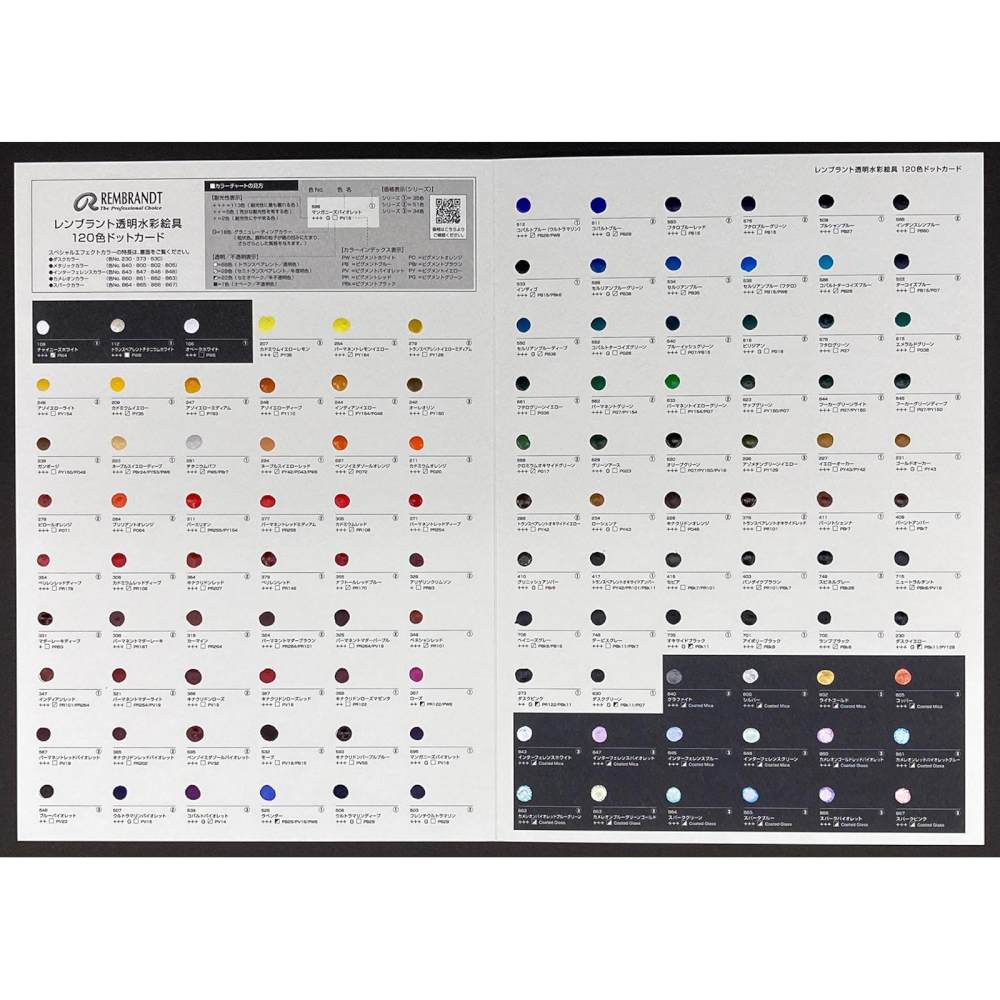 ターレンス レンブラント水彩絵具120色ドットカード RWC-DOT 120458700 水彩絵具の全色を一度に試せるドットカード レンブラント水彩絵具の全色を一度に試せる極めて有用なドットカードです。絵具を買う前に実物で発色を確認することができます。