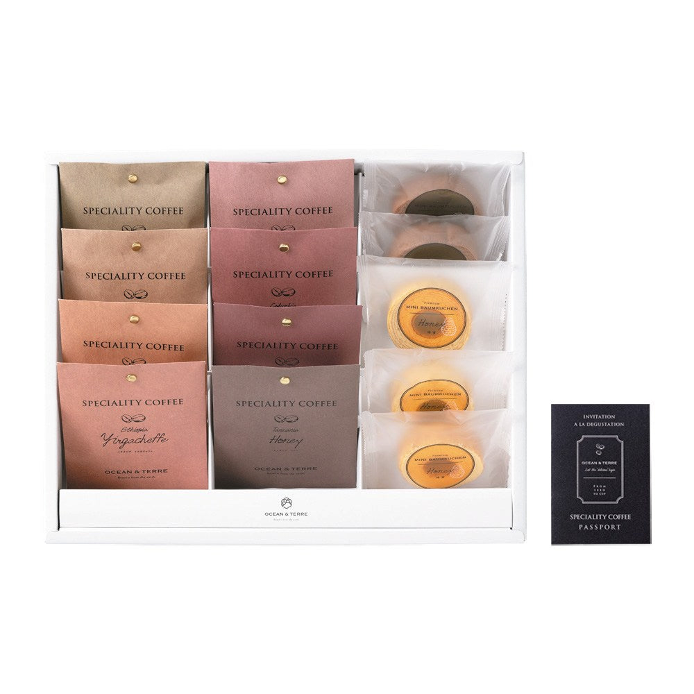 世界各国の厳選された、希少価値あるスペシャルティコーヒーとバームクーヘンのセット。ほっとする憩いの時間をお楽しみください。
