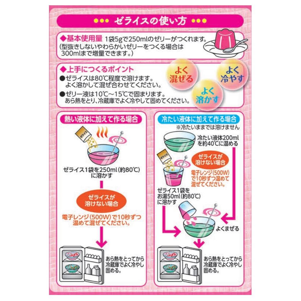 ・お湯の中に振り入れてかき混ぜるだけで簡単に溶ける、顆粒状のゼラチンです。・1袋当たり5g(標準的な使用で250ml分)と、使い切りに手頃なサイズです。・ゼリーなどのデザート類の他、いろいろなお料理やそのままドリンク類に溶かすなどしてご利用いただけます。詳しい使い方を載せた栞が付いています。・ゼラチンはコラーゲンから作られています。