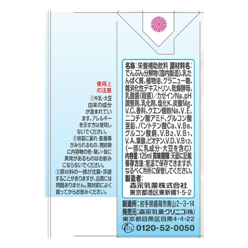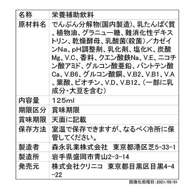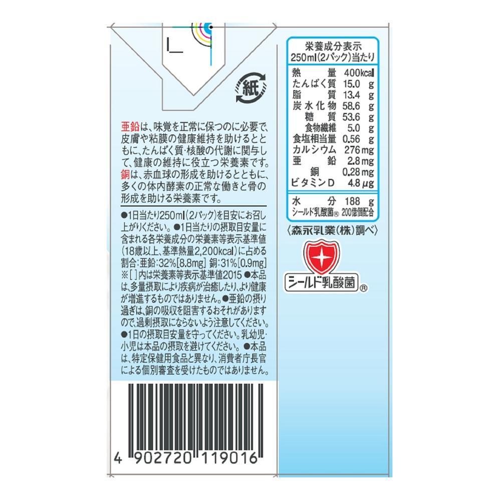 熱量200kcal、たんぱく質7.5g、脂質6.7g、糖質26.8g、食物繊維2.5g、ナトリウム110mg、カルシウム138mg、亜鉛1.4mg、銅0.14mg、ビタミンD1.2μg、水分94g、シールド乳酸菌100億個(1パック当たり)
