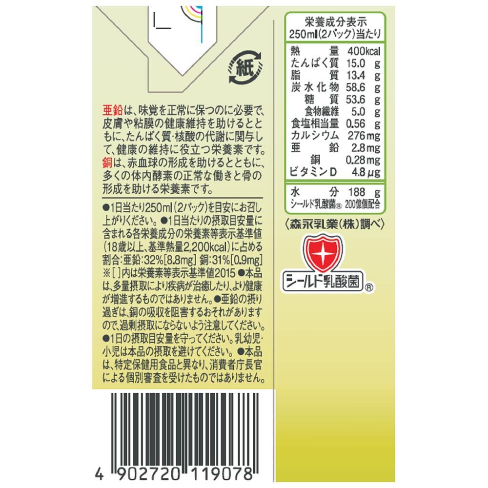 熱量200kcal、たんぱく質7.5g、脂質6.7g、糖質26.8g、食物繊維2.5g、ナトリウム110mg、カルシウム138mg、亜鉛1.4mg、銅0.14mg、ビタミンD1.2μg、水分94g、シールド乳酸菌100億個(1パック当たり)