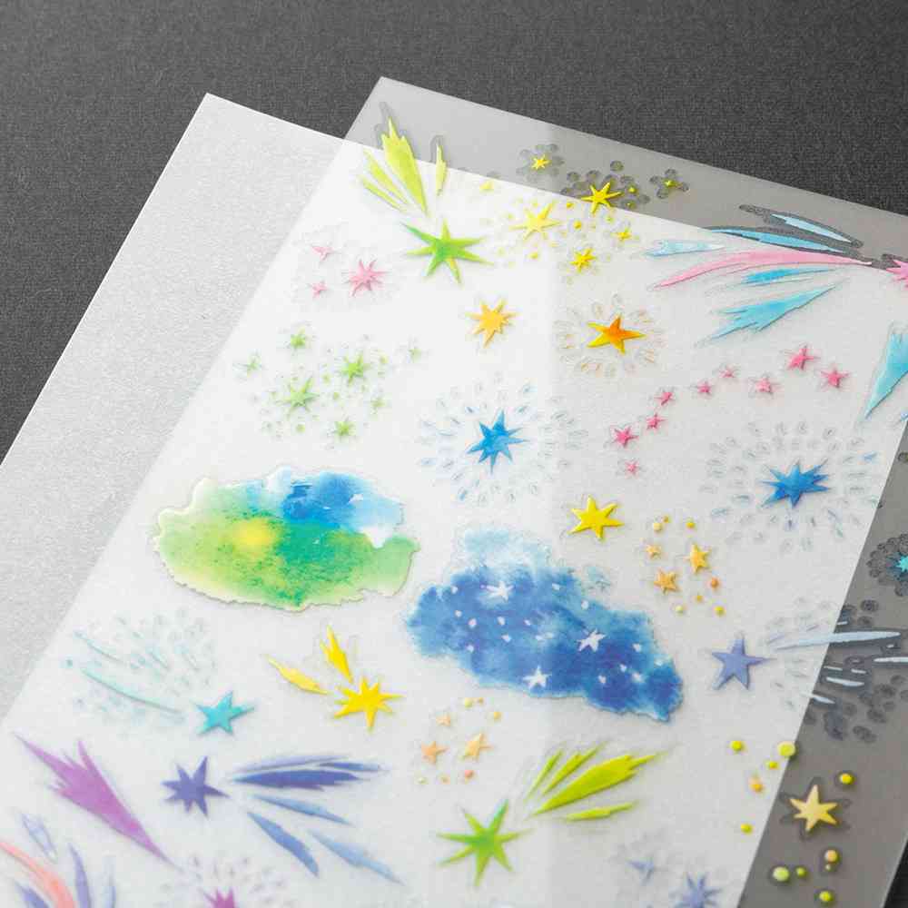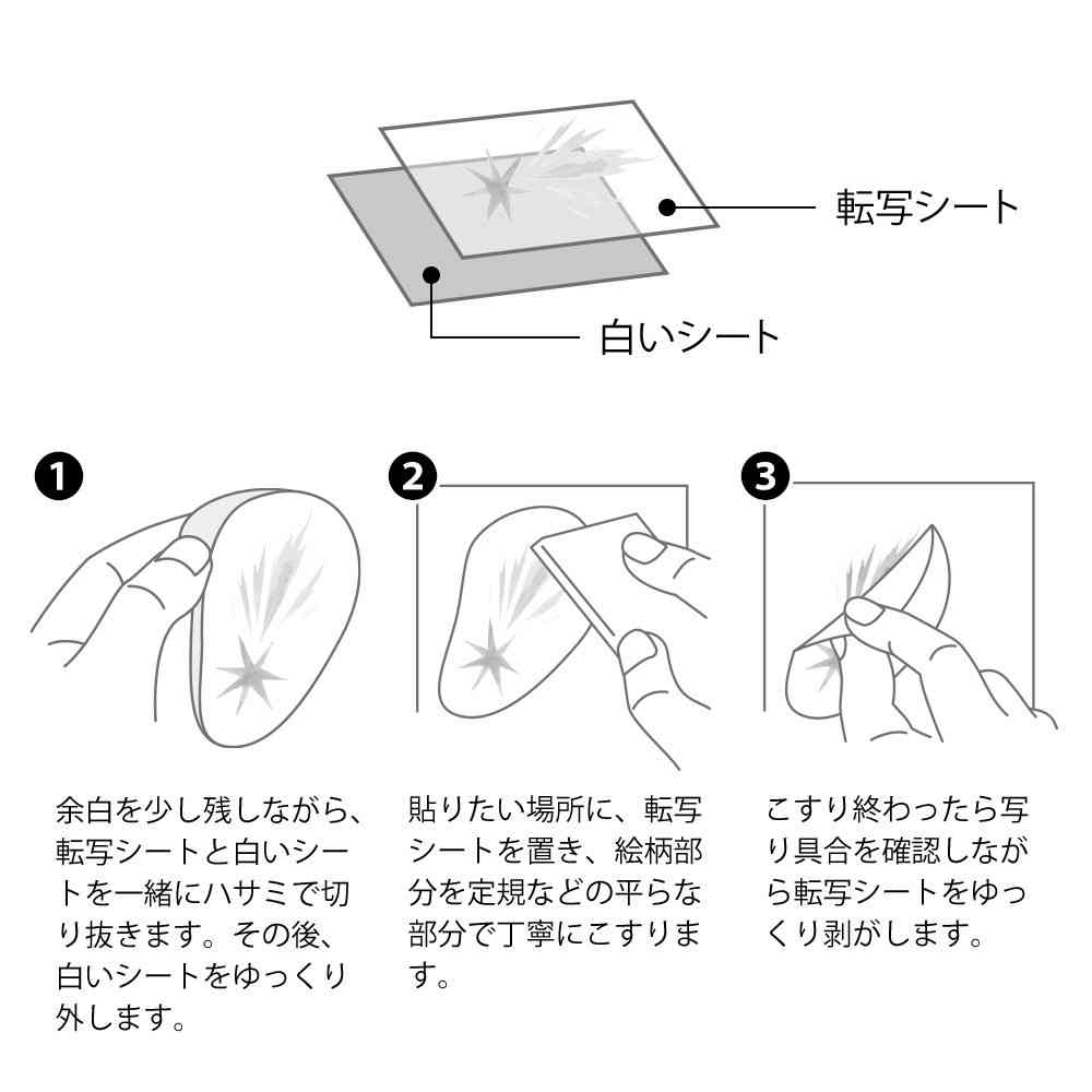 軽い力でこすると、絵を描いたように紙と一体化する転写タイプのシールです。