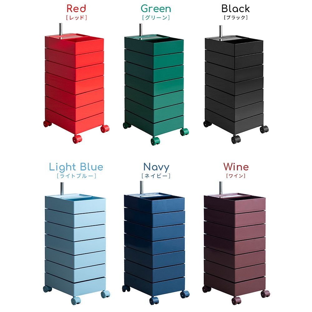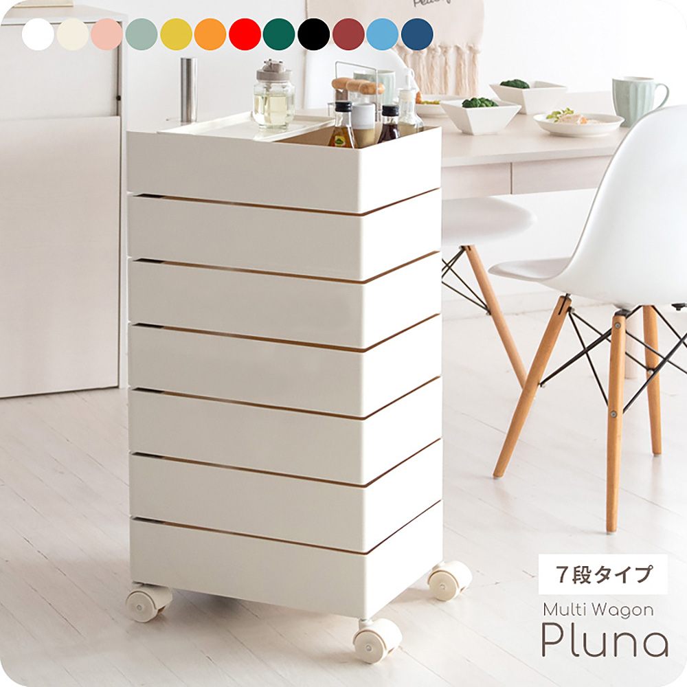 丸みのあるデザインが可愛い多段トローリーワゴン『Pluna(プルーナ)』。4輪キャスターでラクラク移動できます。棚はそれぞれ360度回転式で取り出しやすく、リビングや寝室、デスクなど色々なシーンでマルチにお使いいただけます。ベビー用品の収納にもオススメ。サイズは5段と7段の2タイプ、カラーはホワイト、クリーム、ライトピンク、ライトグリーン、イエロー、オレンジ、レッド、グリーン、ブラック、ライトブルー、ネイビー、ワインの12色展開でお好みに合わせてお選びいただけます。 製品重量:12.4kg