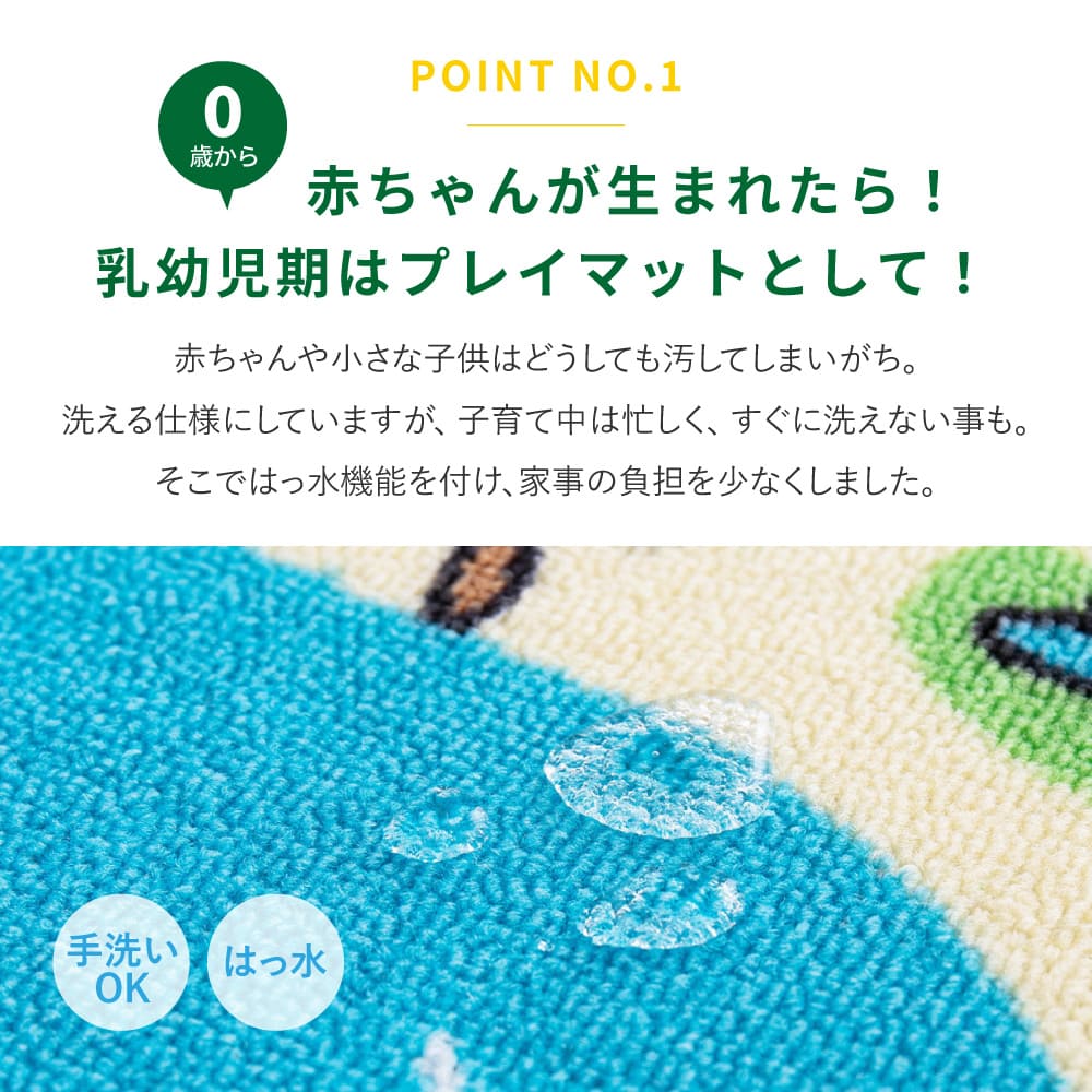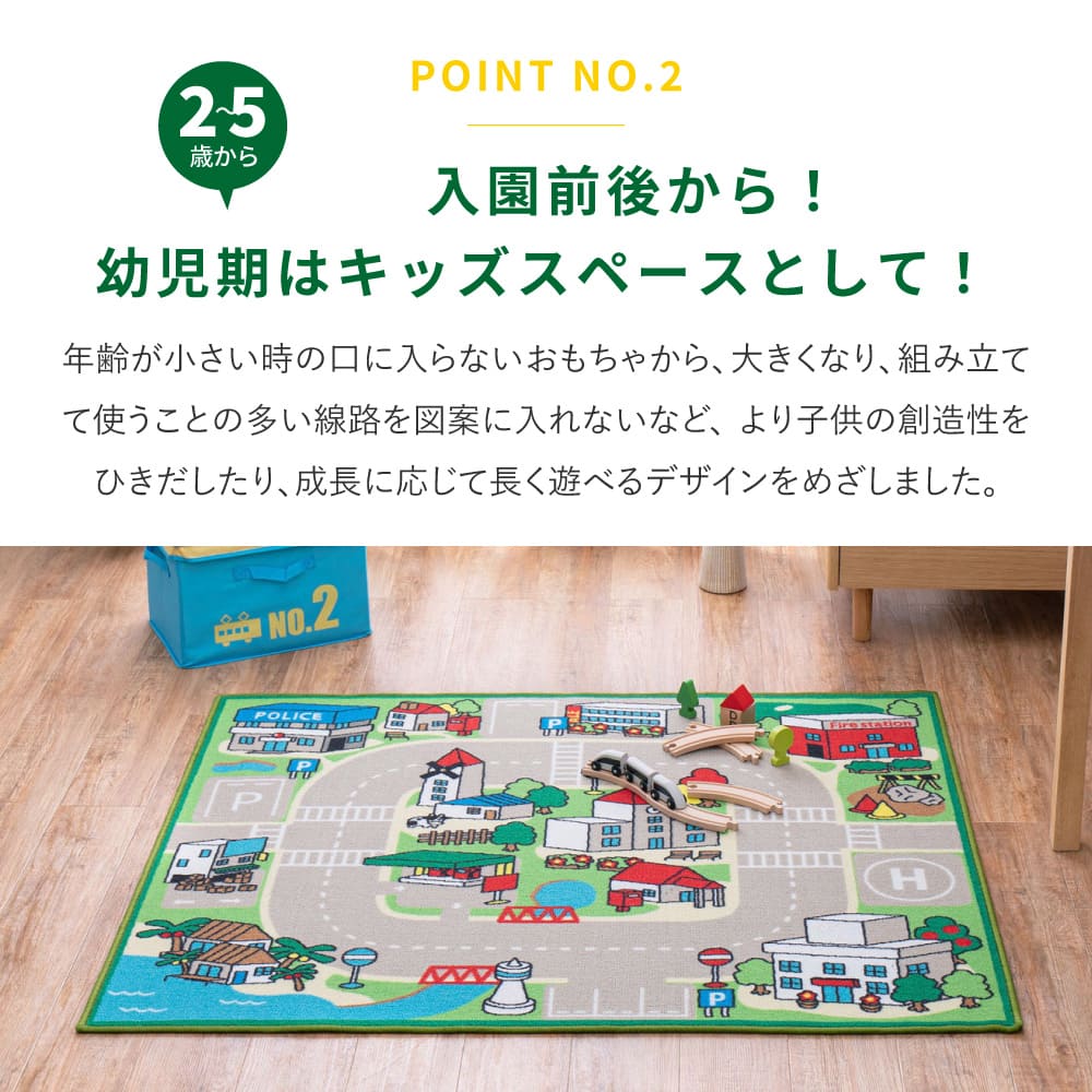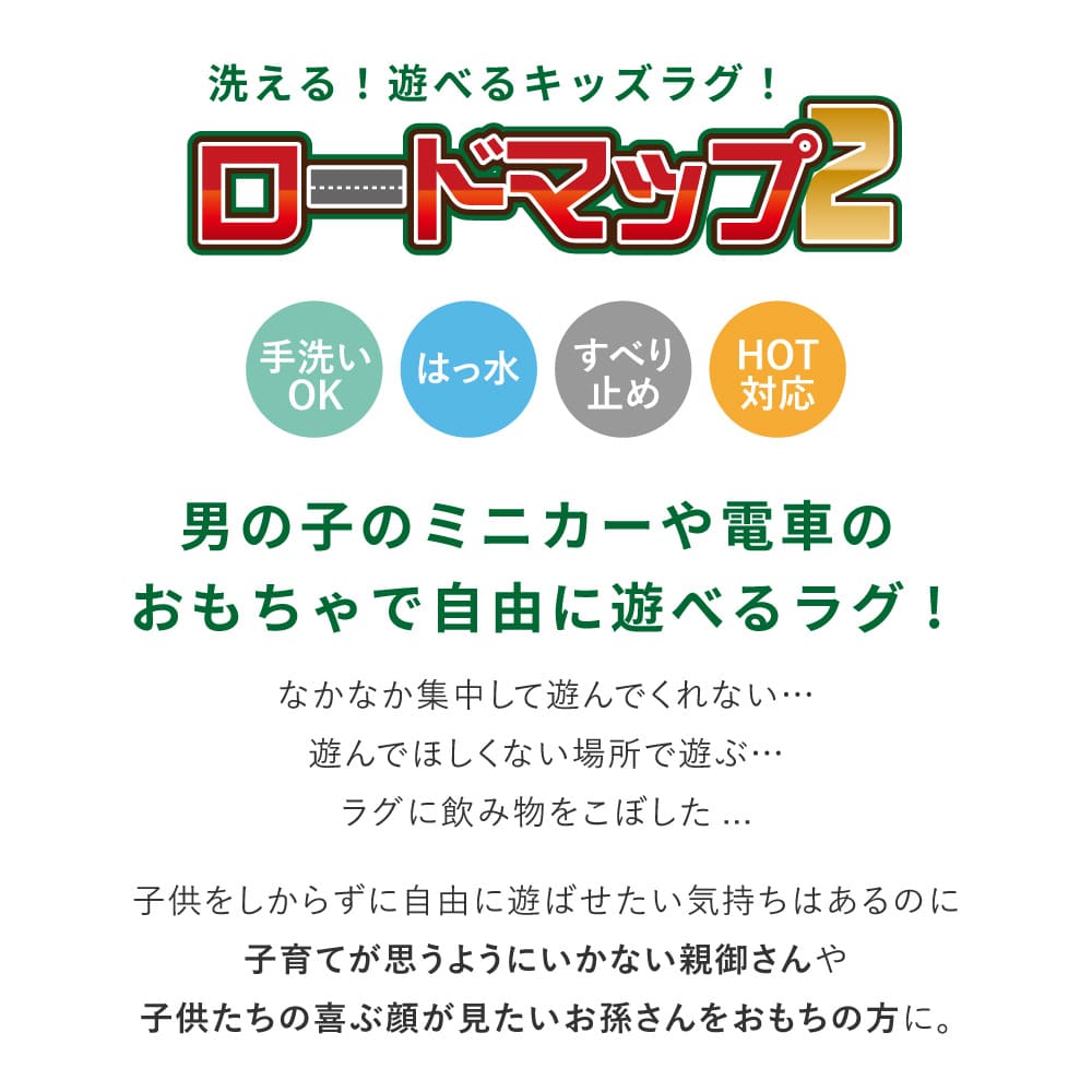 赤ちゃん期はプレイマット、幼児期はキッズコーナーマット・キッズラグ、小学生児童期は学習デスクマットで長く使える道路マップ柄ラグ。誕生日やクリスマスのプレゼントにも人気です。ループパイルはサラッとした感触で弾力性と耐久性があり、しっかりとした踏み心地。毛足がカットされていないため、ホコリやゴミが入り込みにくく、掃除がしやすいのもポイント。はっ水加工を施しているため飲みこぼしなどもサッと拭き取れシミになりにくく、汚れても手洗いOK。裏面は滑りにくい加工付き。ホットカーペットや床暖房に対応しており、オールシーズンお使いいただけます。
