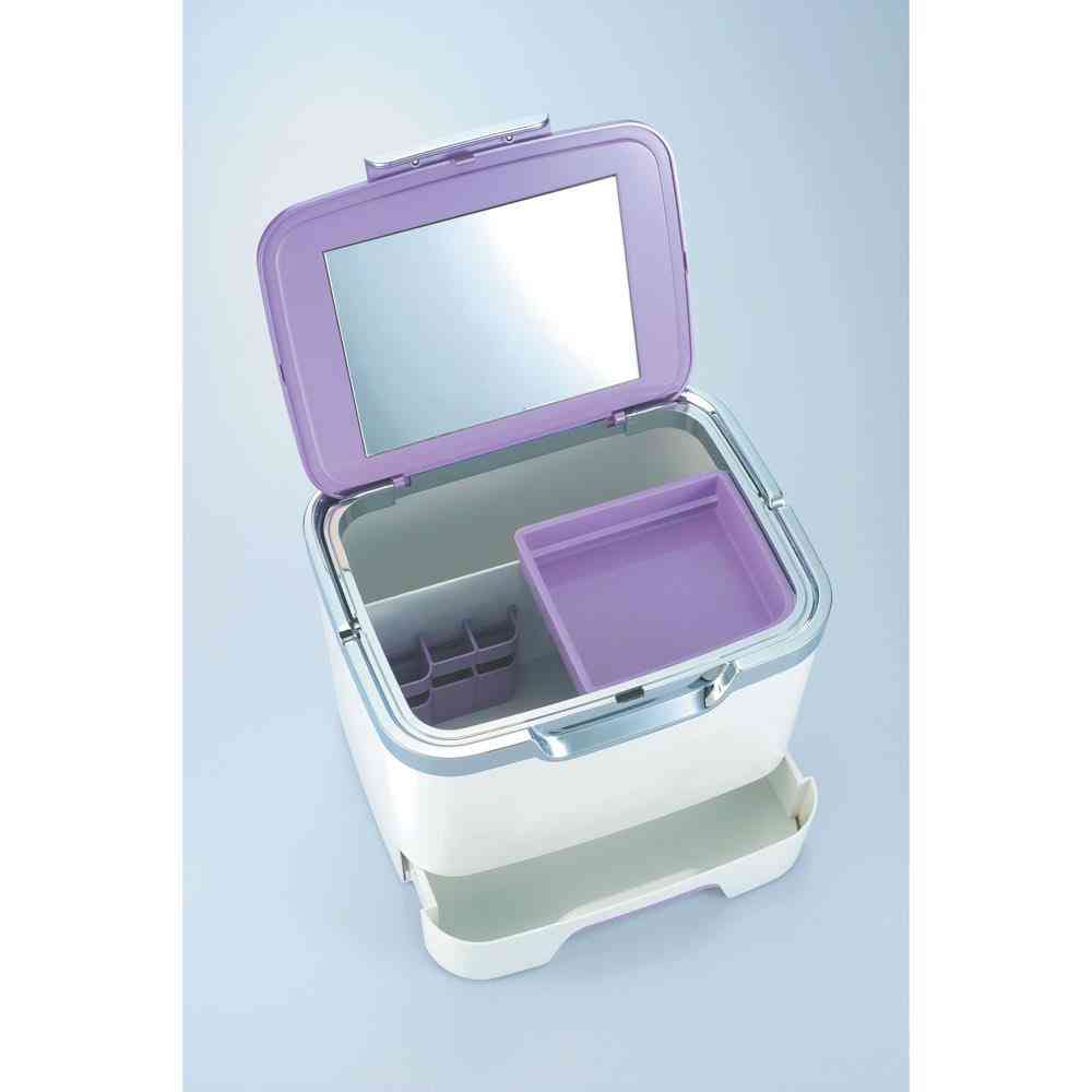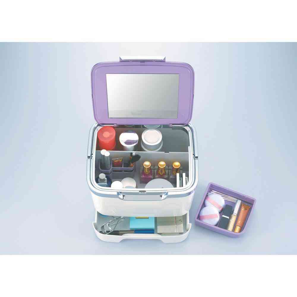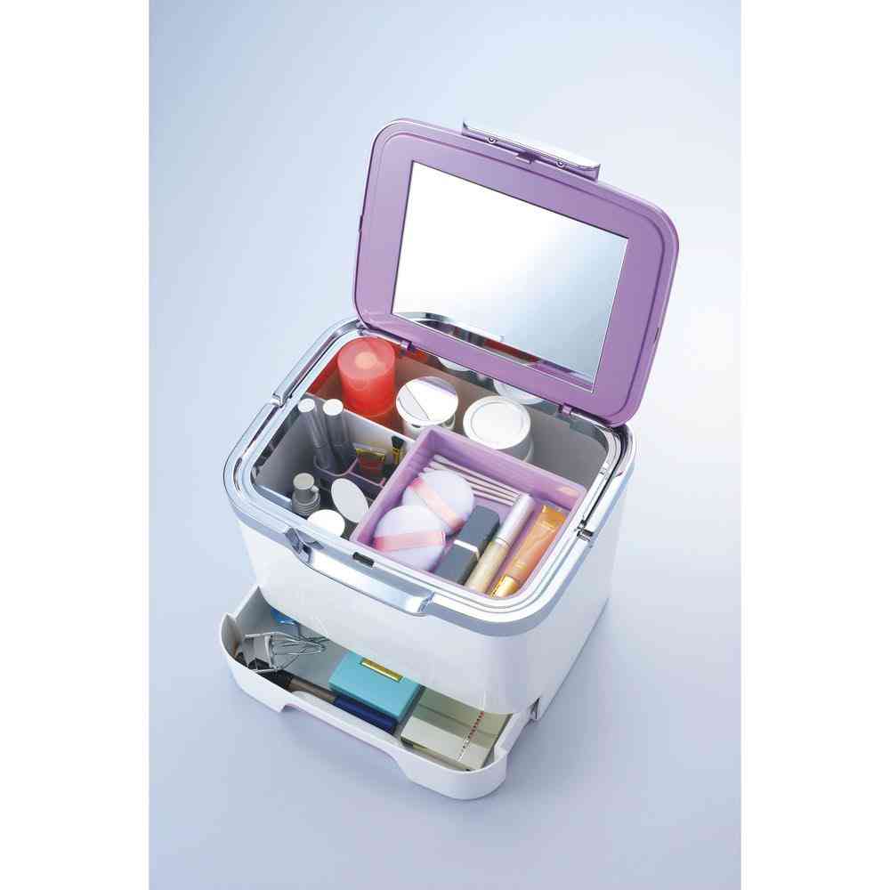 化粧水からメイク小物までのコスメ用品をすっきり収納できる、うれしいコスメボックス。