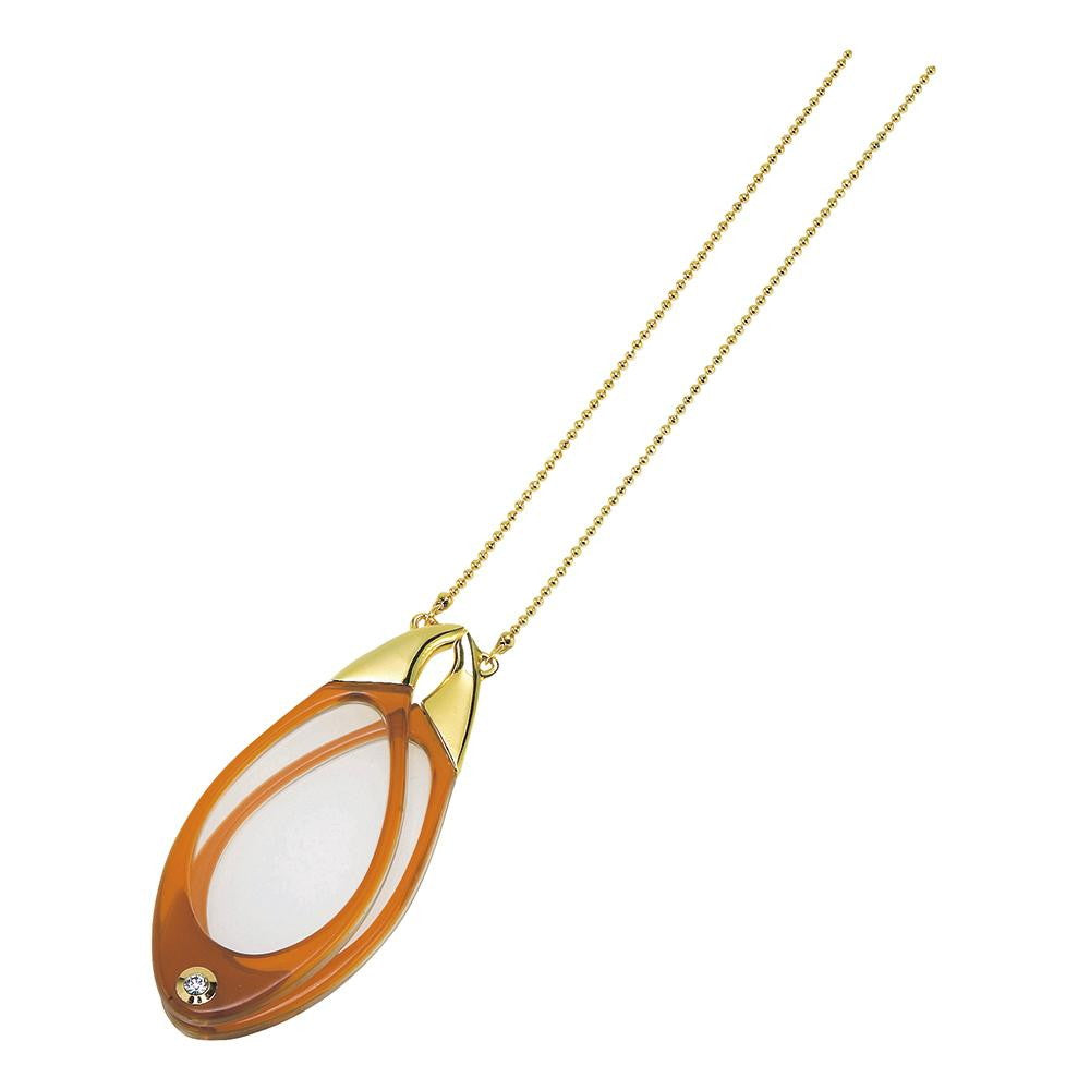 ペンダント型のルーペ ペンダント型のルーペです。開くと両眼で使うことができます。 ※絶対に太陽やレーザー光線などの強い光源を見ないでください。眼に重大な損傷を与えます。