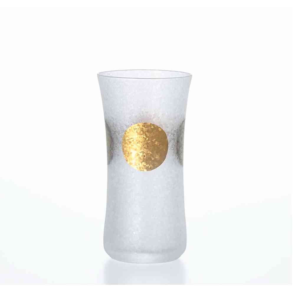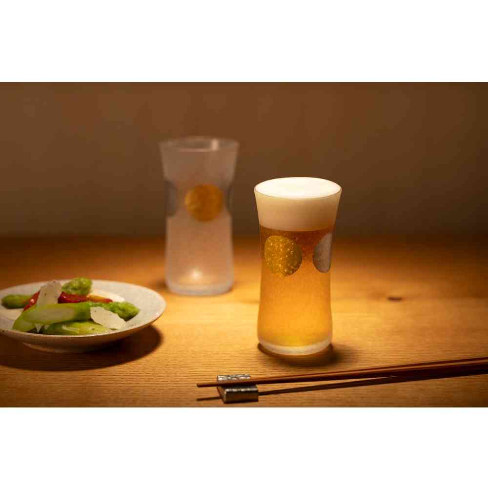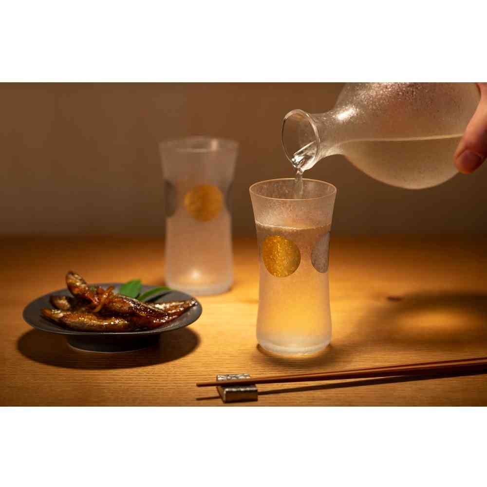 日本の伝統紋様「日月」を施したグラスウェアシリーズです。金の円は太陽、銀の円は月を表します。太陽と月が繰り返し描かれる紋様に「特別な日だけではなく毎日の暮らしの中でこそ上質なものを使っていただきたい」という想いを込めました。「みぞれ仕上げ」によりグラス表面を特殊技術にて涼しげな風合いに仕上げております。