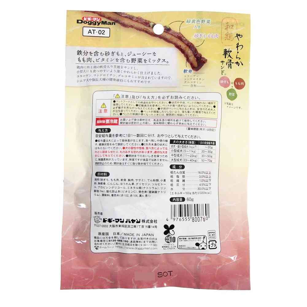 ●鶏肉に、魚と鶏の軟骨入り生地をサンドしました。軟骨に含まれるコラーゲン、コンドロイチン、グルコサミンが、おやつを食べながら摂取出来ます。