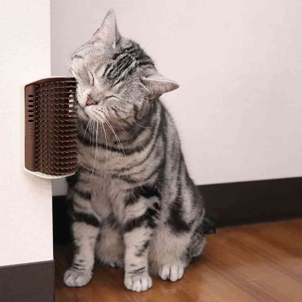 柱や壁の直角やフラットな面など、いろいろな場所に取り付けることができる猫ちゃん用セルフグルーミングブラシ。