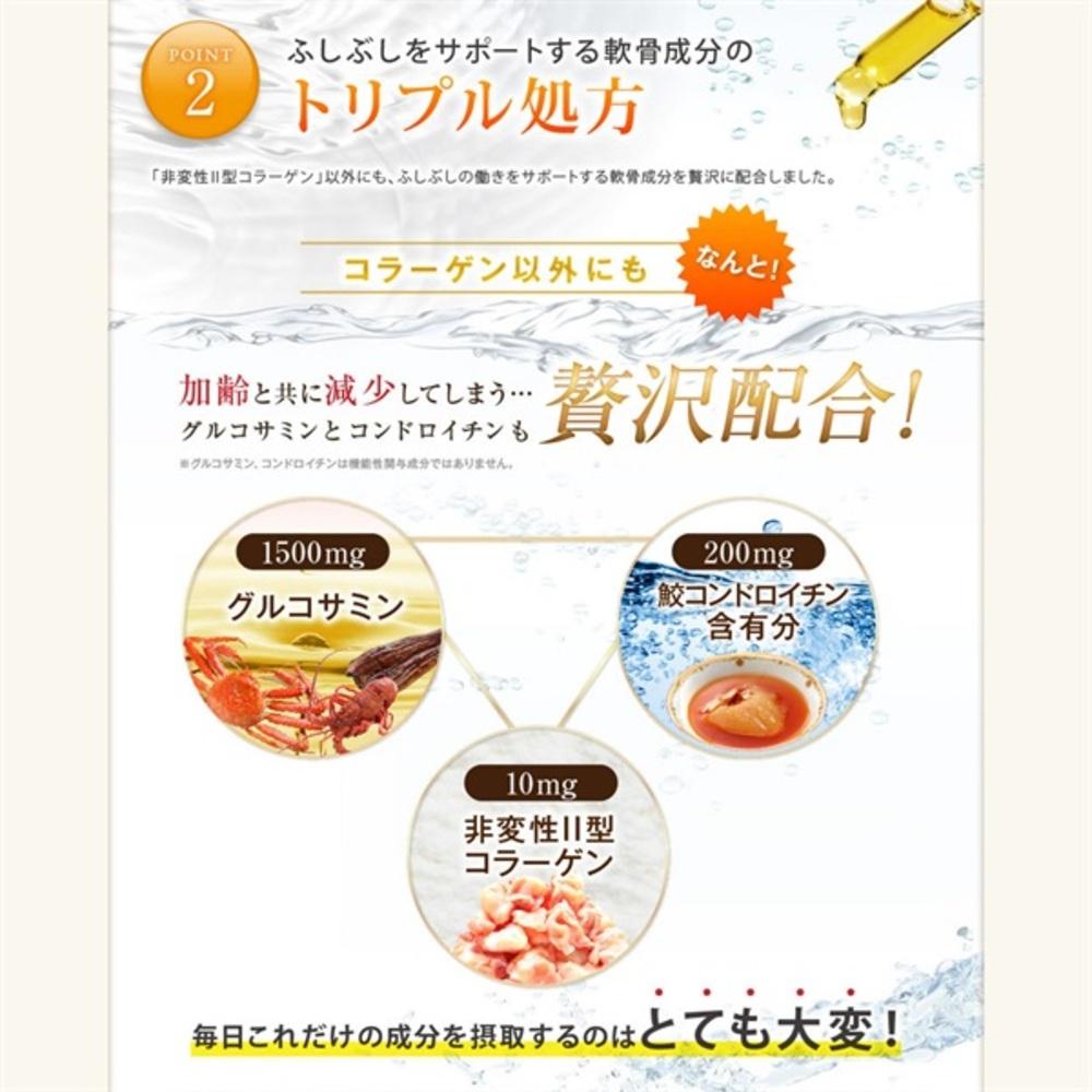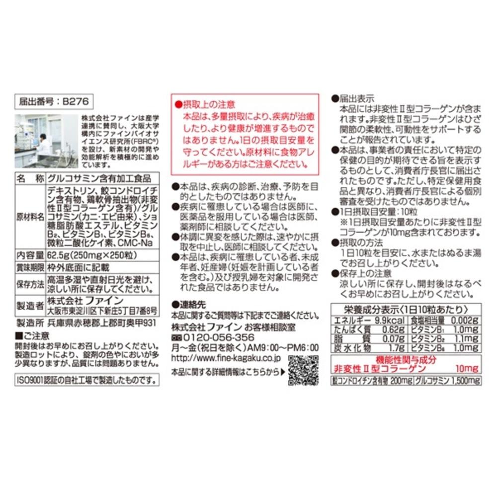 デキストリン、鮫コンドロイチン含有物、鶏軟骨抽出物(非変性II型コラーゲン含有)/グルコサミン(カニ・エビ由来)、ショ糖脂肪酸エステル、ビタミンB2、ビタミンB1、ビタミンB6、微粒二酸化ケイ素、CMC‐Na