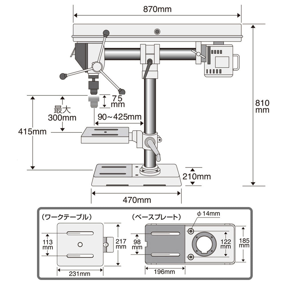 大型(フトコロ寸法90~425mm、全長810mm)ですから、大きな材料の穴あけ加工、長尺のキリを使う穴あけ作業に最適です。