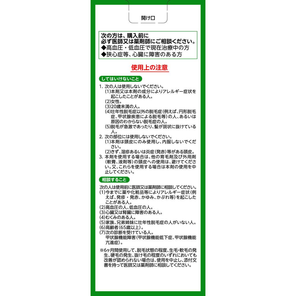 4.使用開始後6ヵ月以内であっても、脱毛状態の悪化や、次のような脱毛が見られた場合は、使用を中止し、この説明書を持って医師又は薬剤師に相談してください