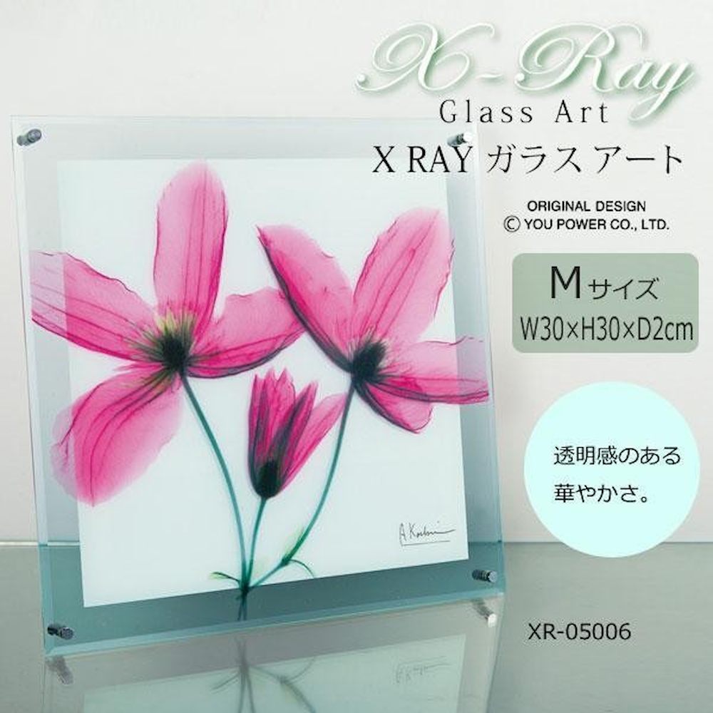 X RAY ガラス アート ジャーニー クレマチス Mサイズ XR-05006 レントゲンモチーフが美しいモダンガラスアート♪ 透き通る花・・・繊細で不思議な質感・・・見ている人を優しく包み込みます。クリアなガラスのプレートに、透明感のあるレントゲンモチーフをカラフルにプリントしたモダンガラスアート。壁面に飾ると15mm奥行きが出るようになっており、光をあてると壁面にほんのりとした影が入り、よりいっそう透明感が増します。どんなインテリアにも映えます。