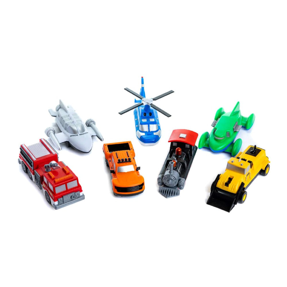 磁石の力で簡単につけたり外したりできるボディを自由に組み合わせ、頭の中に思い描いた想像の乗り物が完成する「ミックス&マッチシリーズ」のデラックス版。消防車・スペースレンジャー・ピックアップトラック・ポリスヘリコプター・蒸気機関車・スピードレーサー・ホイールローダーと働きが異なる7種の乗り物がセットになっています。車が大好きなお子様にぴったりのセットです。