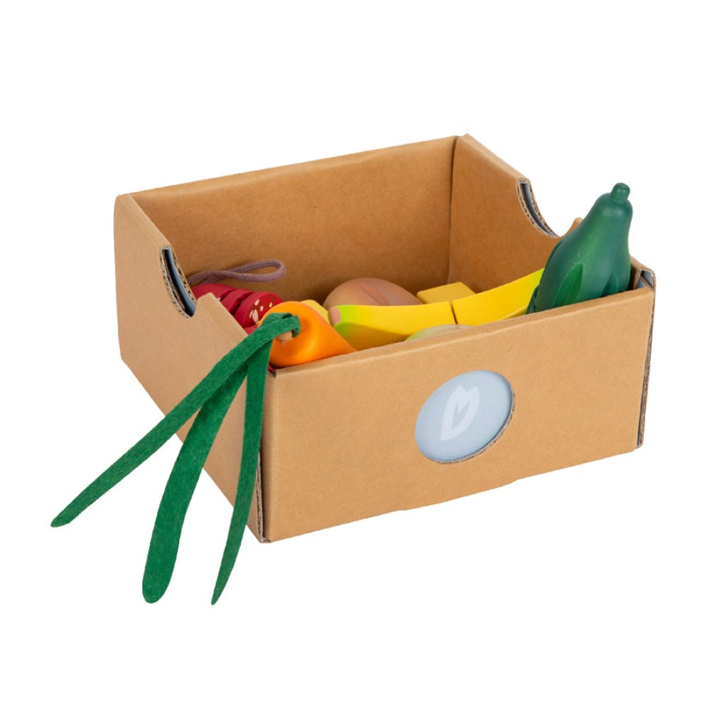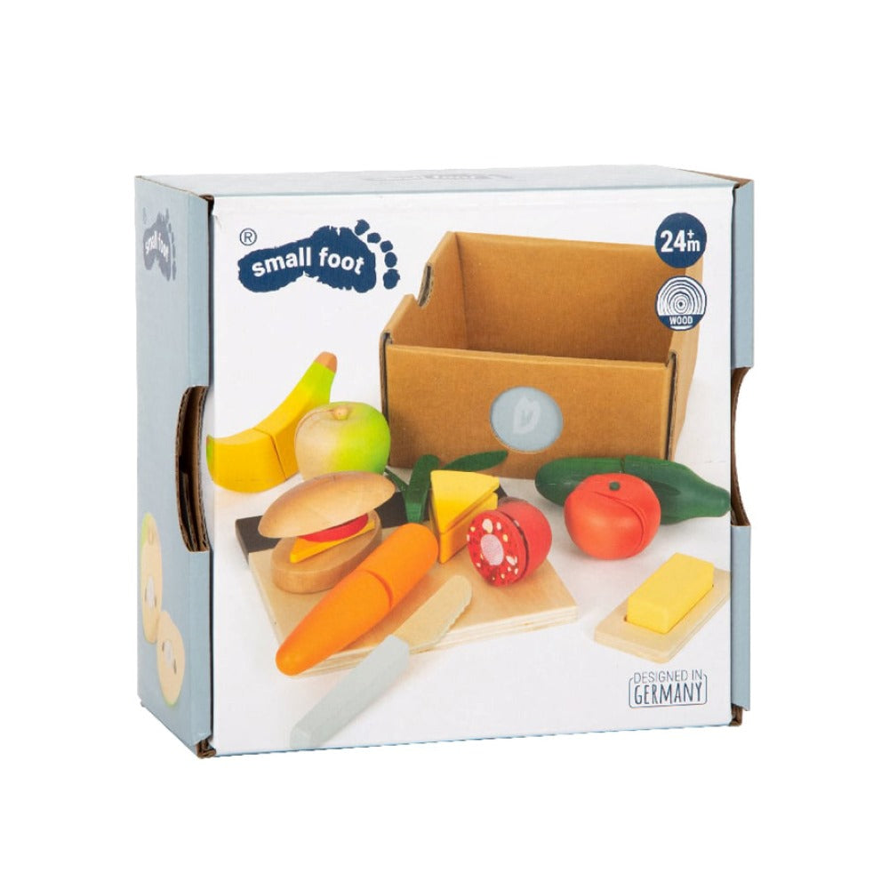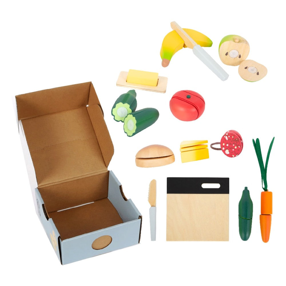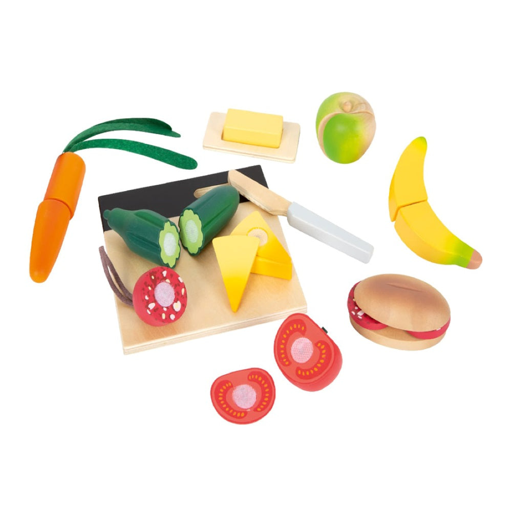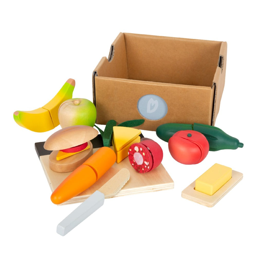 フルーツ、野菜、パンと8種類の食材を含む「切れる食材」のセットです。食材の断面は面ファスナーで接着されているため、包丁で切ったときのざくっとした切り心地が楽しめます。普段大人が料理をする姿を見て、「やってみたい!」という子どもの願いをかなえてくれます。パッケージは箱に組み立てられ収納にも便利です。トマト、きゅうり、にんじん、りんご、バナナ、チーズ、サラミ、バター、パン、バター台、まな板、ナイフ各1点