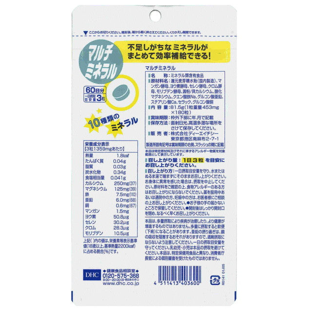 DHC的“多种矿物质”是含有钙、铁、锌等10种互补矿物质的均衡补充剂。明确了政府为具有营养功能声称的食品制定的所有五种矿物质(钙、镁、铁、锌、铜)的标准。此外,我们还添加了硒、铬、锰、碘和钼 5 种元素。每天只需3粒,即可有效摄取现代人容易缺乏的所有矿物质。而且,价格约为每天17日元*,可以轻松地每天继续使用。推荐给不吃太多蔬菜或经常外出就餐的人、生活方式忙碌且不规律的人以及关心未来健康的人。 _x000D_