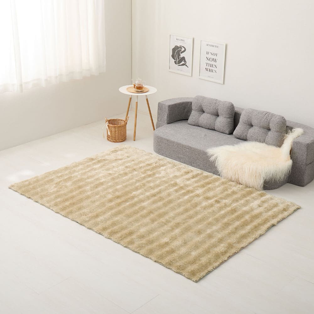 表面をなめらかな凹凸にカットし、独特なポコポコ感を表現。目付量約1100g/m²のしっかりとした密度でボリューム感たっぷりの贅沢な一枚に。光沢のある糸は光の当たり方によって様々な表情をみせてくれます。また、ホルムアルデヒドの試験を乳幼児の基準でクリアしているため、小さなお子さまやペットの居るご家庭でも安心です。裏面にはラグのずれを防止する滑り止め加工付き。ホットカーペットや床暖房の上に敷いてもお使いいただけます。