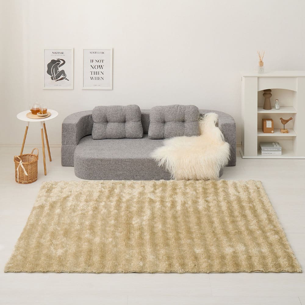 表面をなめらかな凹凸にカットし、独特なポコポコ感を表現。目付量約1100g/m²のしっかりとした密度でボリューム感たっぷりの贅沢な一枚に。光沢のある糸は光の当たり方によって様々な表情をみせてくれます。また、ホルムアルデヒドの試験を乳幼児の基準でクリアしているため、小さなお子さまやペットの居るご家庭でも安心です。裏面にはラグのずれを防止する滑り止め加工付き。ホットカーペットや床暖房の上に敷いてもお使いいただけます。