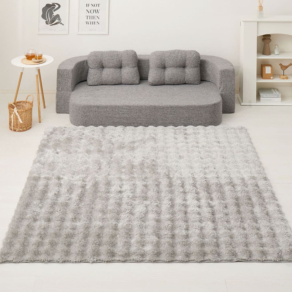 表面をなめらかな凹凸にカットし、独特なポコポコ感を表現。目付量約1100g/m²のしっかりとした密度でボリューム感たっぷりの贅沢な一枚に。光沢のある糸は光の当たり方によって様々な表情をみせてくれます。また、ホルムアルデヒドの試験を乳幼児の基準でクリアしているため、小さなお子さまやペットの居るご家庭でも安心です。裏面にはラグのずれを防止する滑り止め加工付き。ホットカーペットや床暖房の上に敷いてもお使いいただけます。