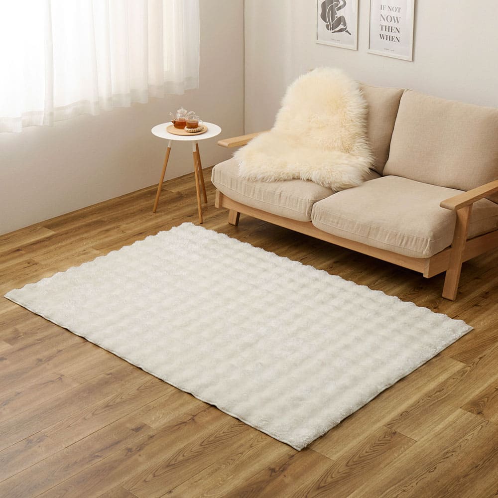 表面をなめらかな凹凸にカットし、独特なポコポコ感を表現。目付量約1100g/m²のしっかりとした密度でボリューム感たっぷりの贅沢な一枚に。光沢のある糸は光の当たり方によって様々な表情をみせてくれます。また、ホルムアルデヒドの試験を乳幼児の基準でクリアしているため、小さなお子さまやペットの居るご家庭でも安心です。裏面にはラグのずれを防止する滑り止め加工付き。ホットカーペットや床暖房の上に敷いてもお使いいただけます。