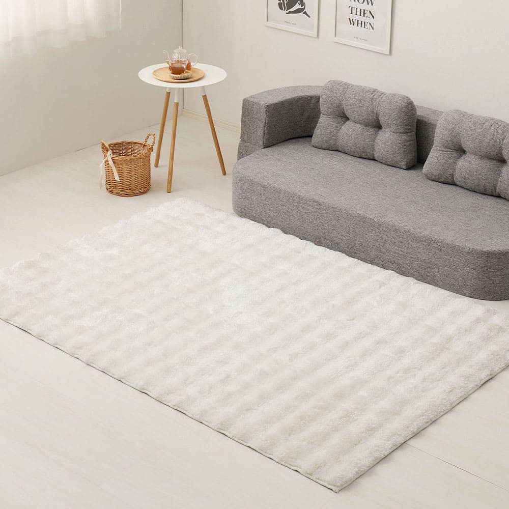 表面をなめらかな凹凸にカットし、独特なポコポコ感を表現。目付量約1100g/m²のしっかりとした密度でボリューム感たっぷりの贅沢な一枚に。光沢のある糸は光の当たり方によって様々な表情をみせてくれます。また、ホルムアルデヒドの試験を乳幼児の基準でクリアしているため、小さなお子さまやペットの居るご家庭でも安心です。裏面にはラグのずれを防止する滑り止め加工付き。ホットカーペットや床暖房の上に敷いてもお使いいただけます。