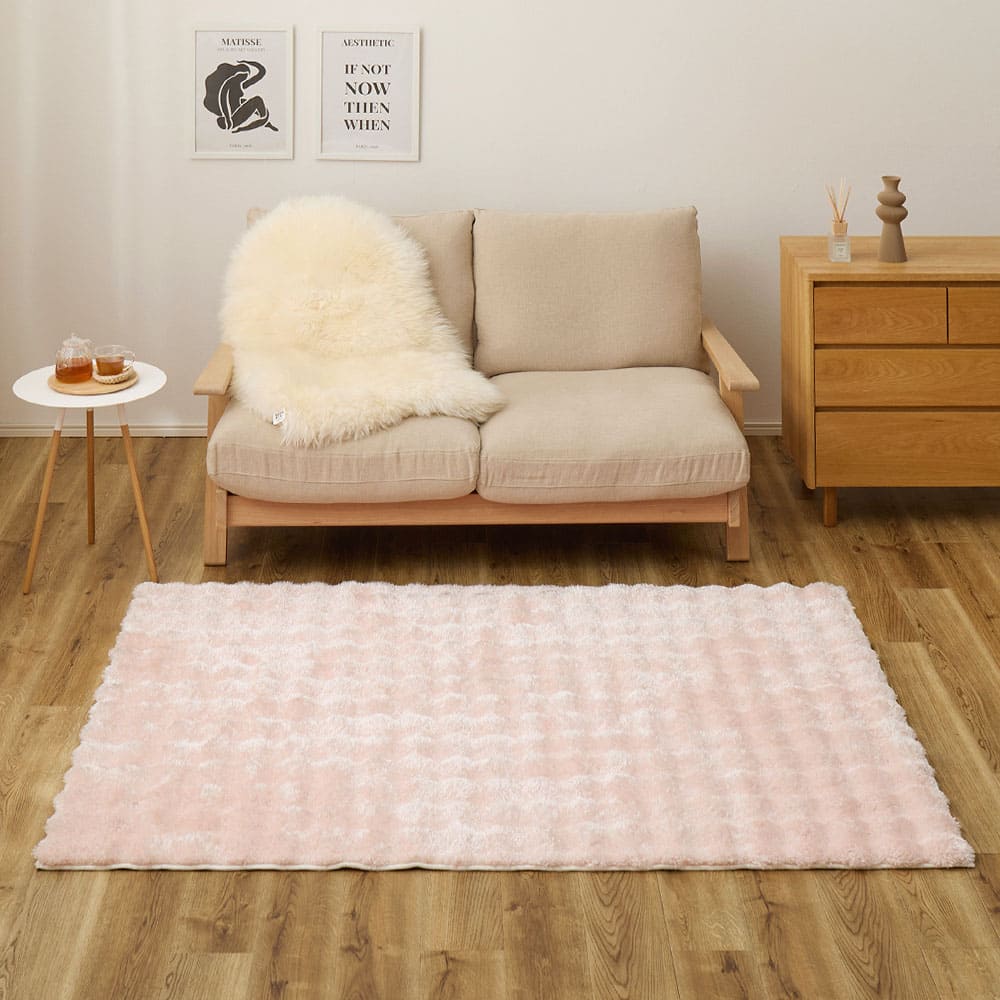 表面をなめらかな凹凸にカットし、独特なポコポコ感を表現。目付量約1100g/m²のしっかりとした密度でボリューム感たっぷりの贅沢な一枚に。光沢のある糸は光の当たり方によって様々な表情をみせてくれます。また、ホルムアルデヒドの試験を乳幼児の基準でクリアしているため、小さなお子さまやペットの居るご家庭でも安心です。裏面にはラグのずれを防止する滑り止め加工付き。ホットカーペットや床暖房の上に敷いてもお使いいただけます。