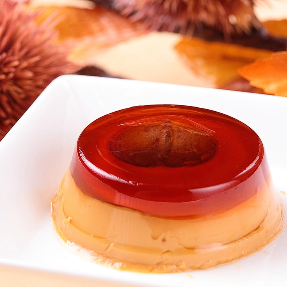 栗本来の自然な甘みのマロンプリンと、ほろ苦いカラメル風味のゼリーを二層に重ね、渋皮付きの栗を丸ごとトッピングした銀座千疋屋オリジナルのマロンプリンです。