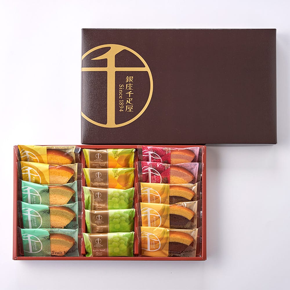 一層一層丁寧に焼き上げた生地と、果汁を加えて仕上げた生地の2つの味が絶妙なハーモニーの「フルーツクーヘン」。なめらかで口当たりのやさしいフルーツクリームと香り豊かな果肉を香ばしいクッキーでサンドした「フルーツサンド」の詰合せです。