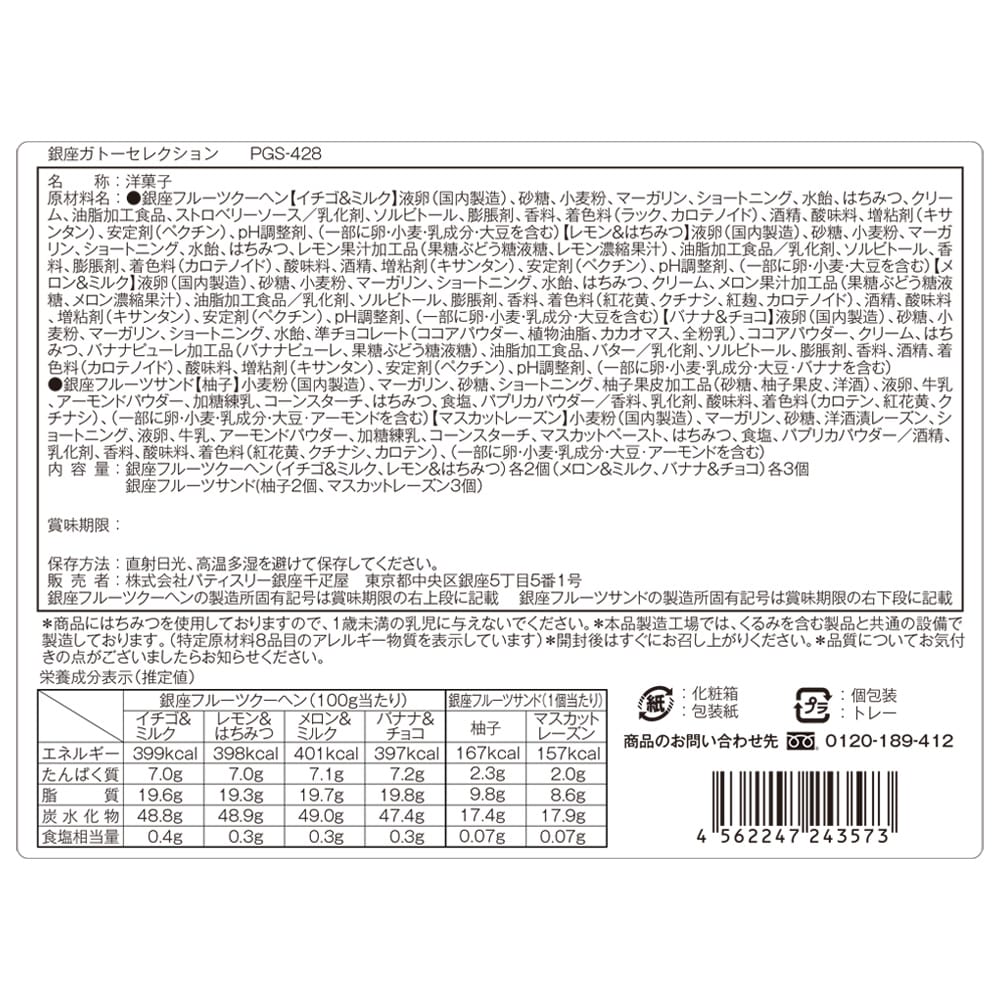 ●内容量銀座フルーツクーヘン(いちご&ミルク・レモン&はちみつ 各2個、メロン&ミルク・バナナ&チョコ 各3個)、銀座フルーツサンド(柚子 2個、マスカットレーズン 3個)