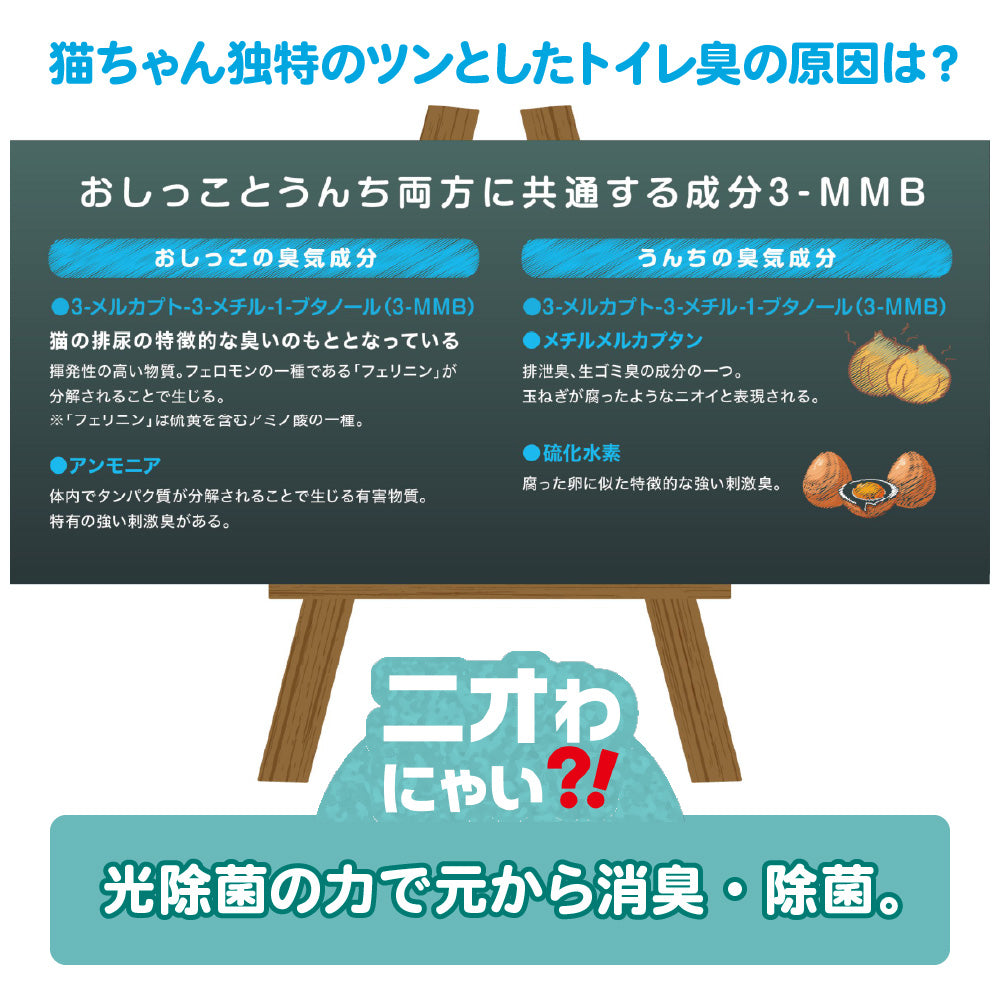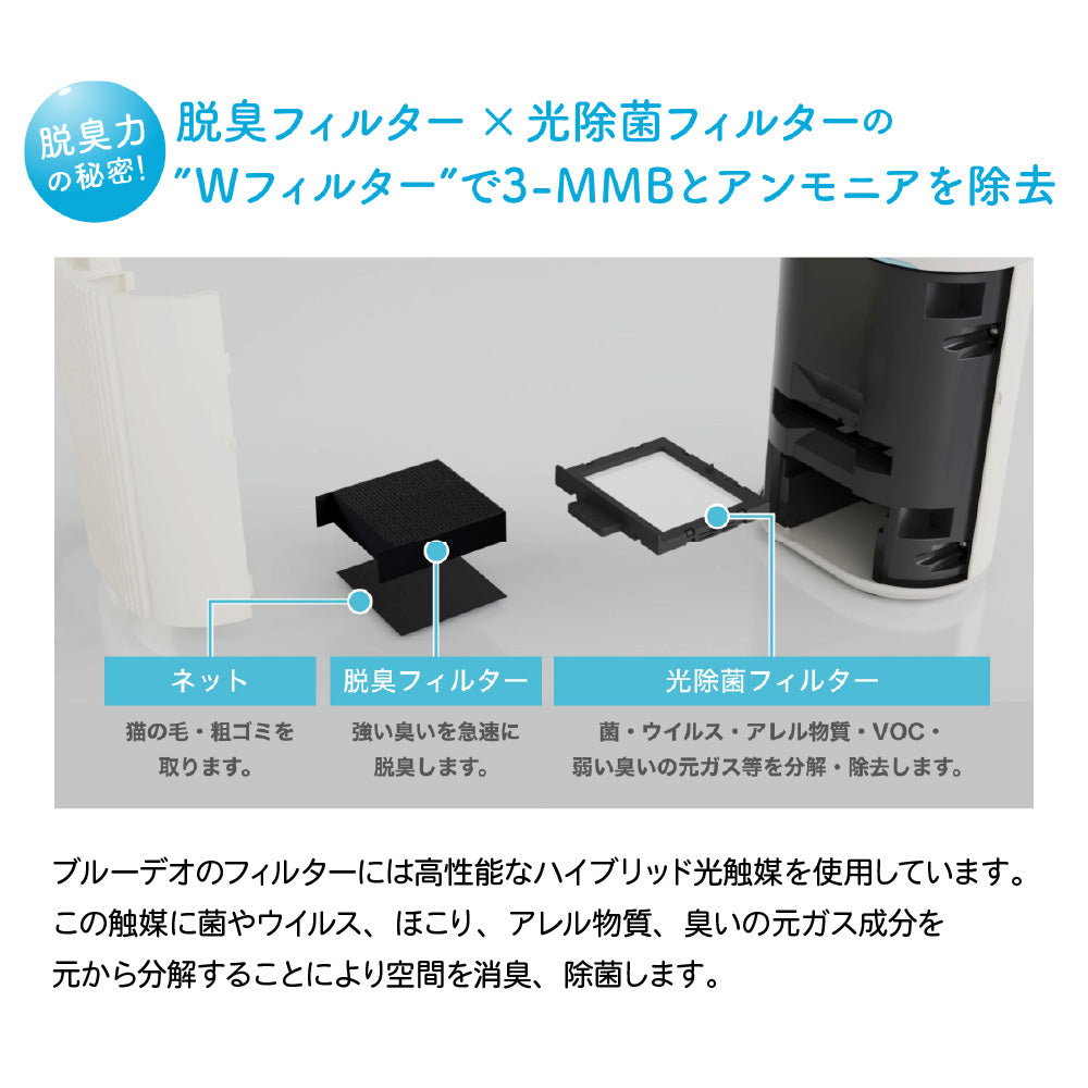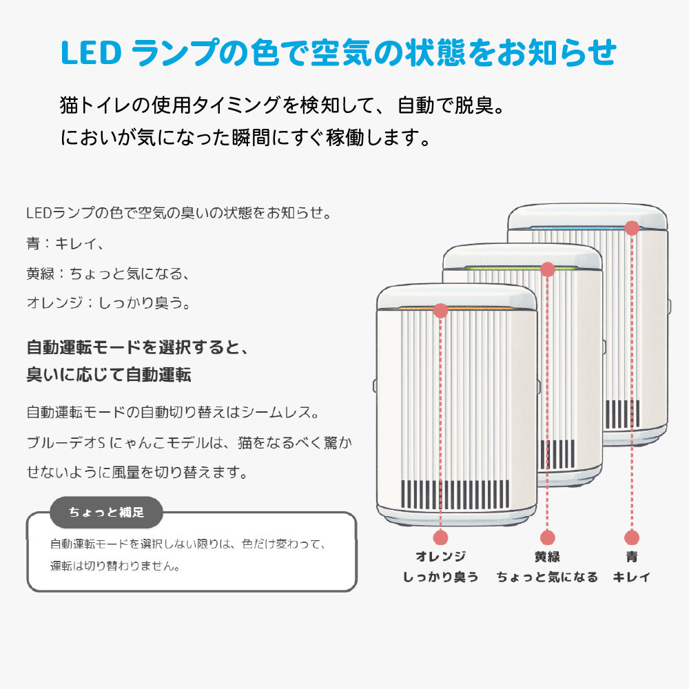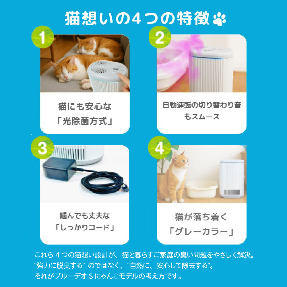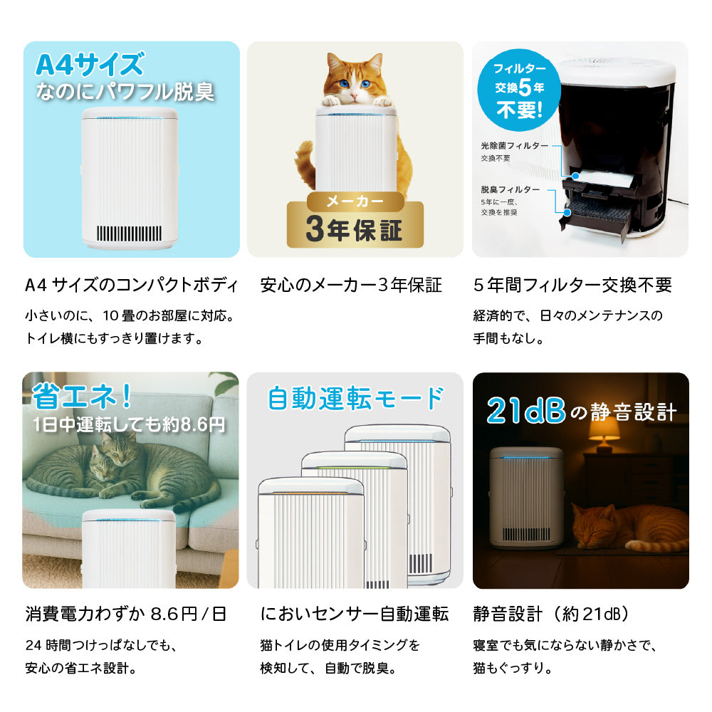 ●猫の糞尿臭に含まれる成分「3-MMB」や「アンモニア」等を光除菌技術で徹底除去。●トイレ横に置くだけで、ツンとした臭いを強力に除去し、いつも清潔な空間に。●猫想い4つの特徴。1:猫にやさしい「光除菌方式」。猫への影響にも配慮した、化学物質を放出しない方式です。2:驚かせない静音設計。モーターの回転をゆるやかに上げ、音に敏感な猫もリラックス。3:噛みに強い電源コード。丈夫なPVC編み込み仕様で、断線リスクを軽減。4:猫が落ち着くグレーカラー。●猫トイレのそばにも置けるコンパクトサイズなのに、室内臭も10畳までしっかり脱臭。●5年間フィルター交換不要。光除菌フィルター+脱臭フィルターで脱臭力長持ち。