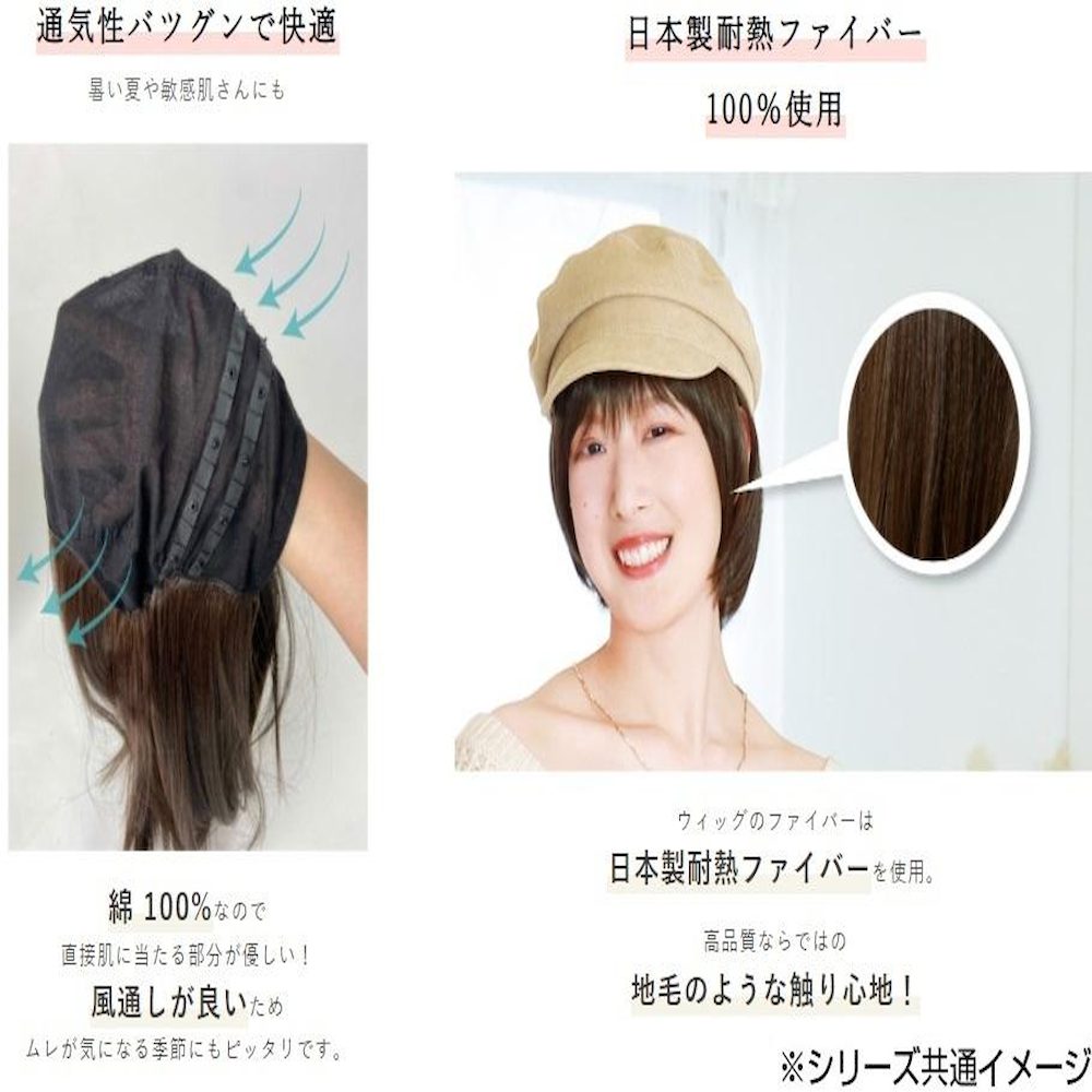アンダー型の帽子ウィッグ!コットン100%キャップの縁周りに耐熱ファイバーを縫製しています。全頭にファイバーを縫製していないインナー型タイプなので、帽子やターバンの下に着けることができ、通気性抜群でや肌触りも柔らか。前髪はスナップボタンで取り外し可能です。取り付け位置は2段階あり長さ調節が可能です。