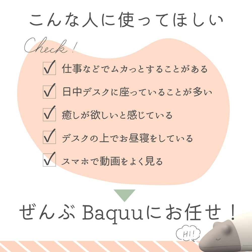 老舗寝具メーカーが3年かけて開発したお昼寝用。 バクの形をしたバクーがあなたの悪い夢を食べちゃいます♪ お昼寝・マッサージ・スマホスタンドなどデスクワークの味方に!