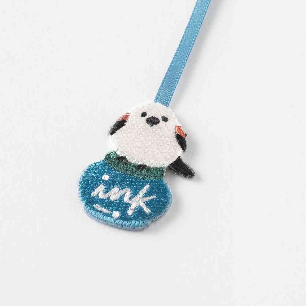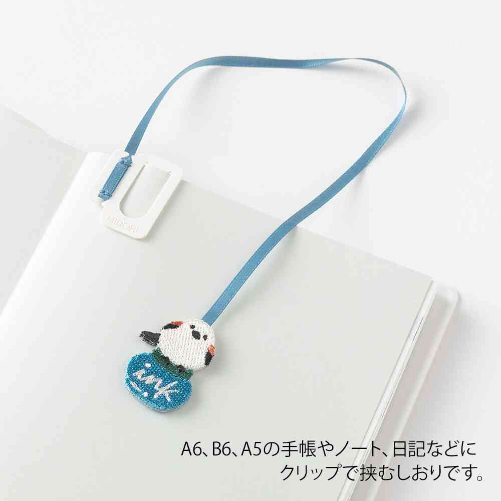 手帳や日記などにクリップで挟み込むだけで、かわいい刺繍チャームがついたしおりになります。