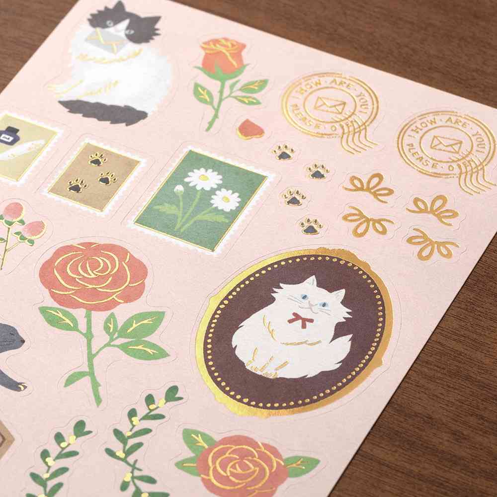 ふわふわの毛並みのネコとバラの絵柄がメインとなる、アンティーク風イラストのコラージュシールがたっぷりついたレターセットです。
