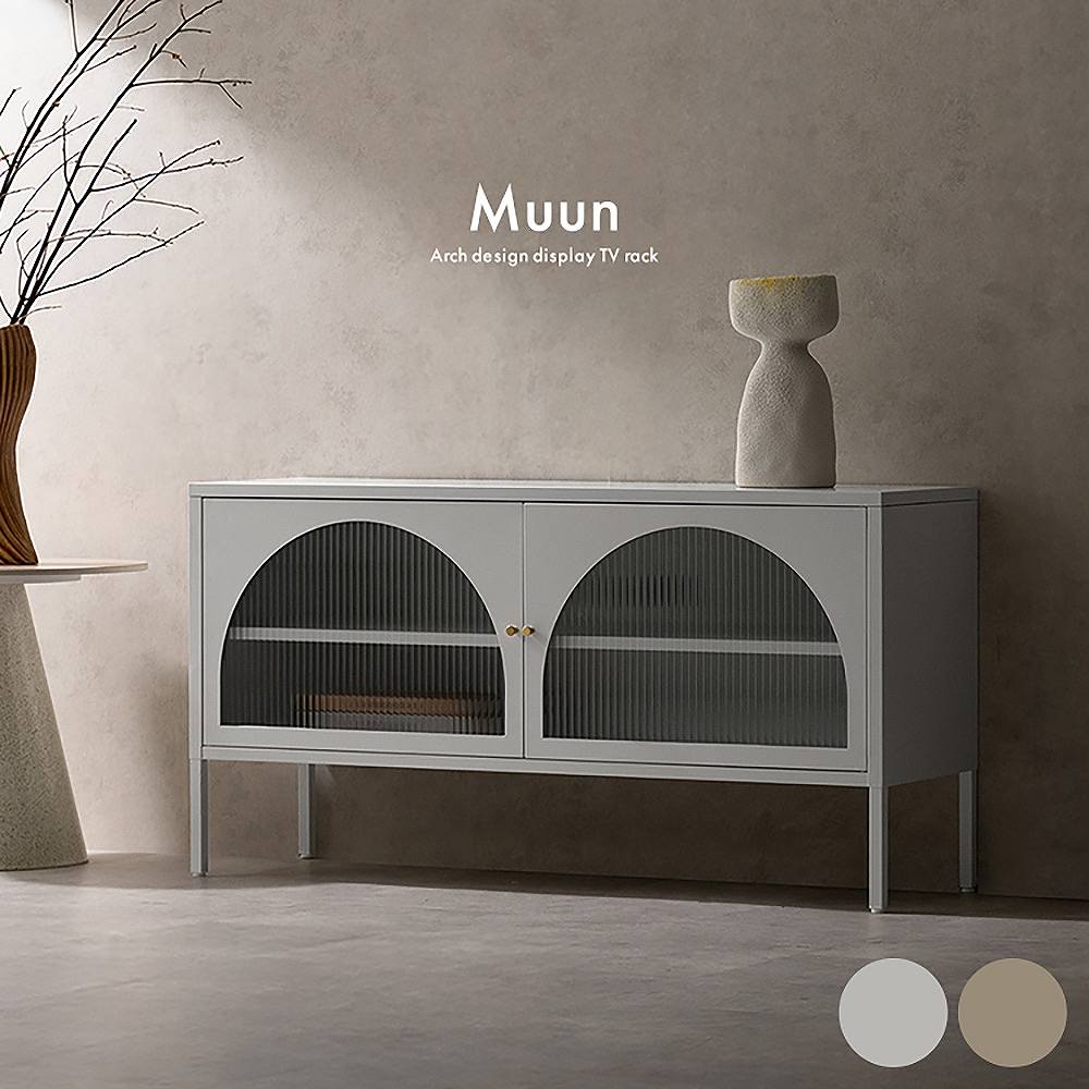 クラシカルなアーチとモダンな直線を融合させた、タイムレスな美しさ。見せる収納を楽しむテレビラック『Muun(ムーン)』。3段階で調整できる可動棚で、収納物に合わせた収納が可能。光を透過するガラス扉が飾る物を引き立て、軽やかな抜け感を演出します。製品重量:17.2kg 組立式(約45分)