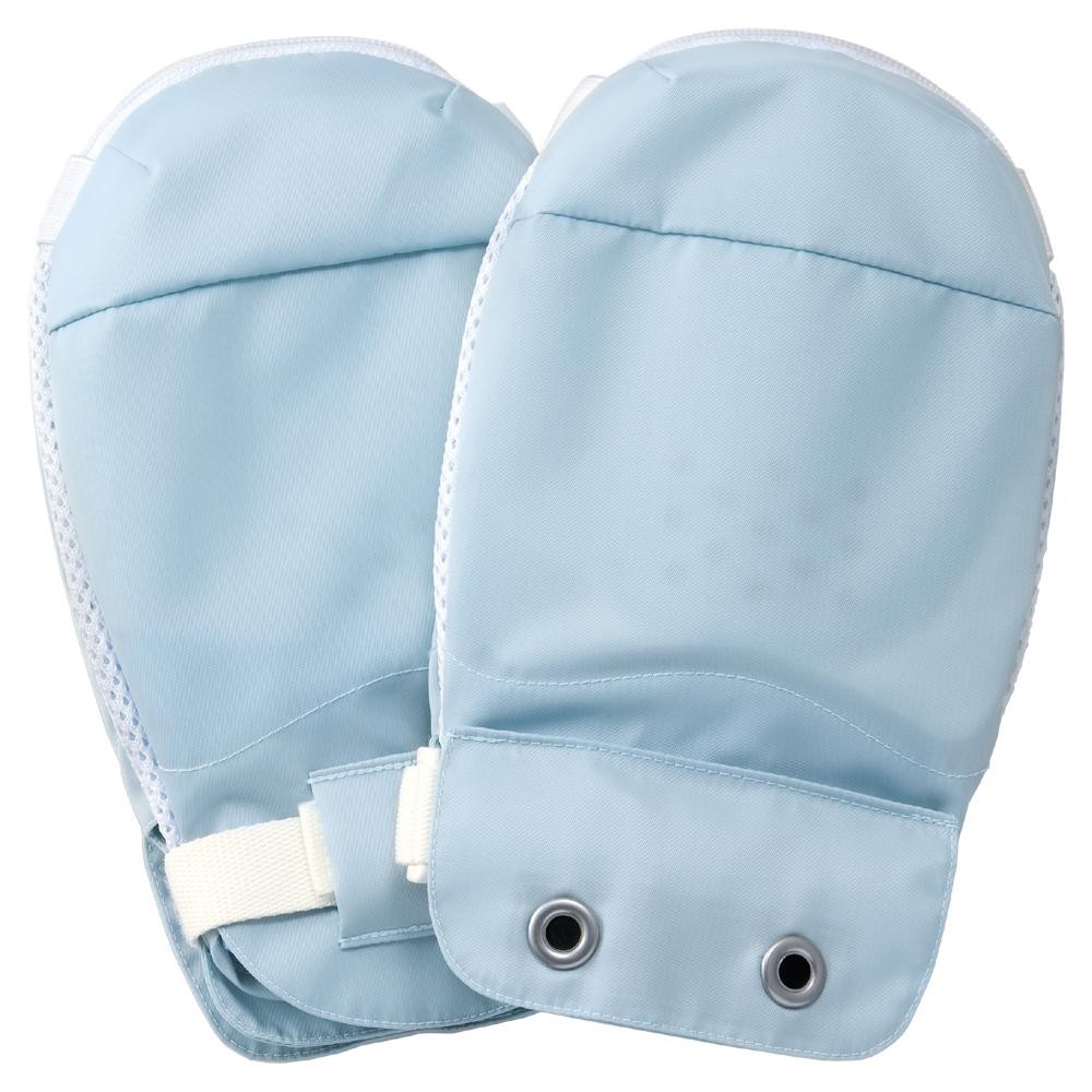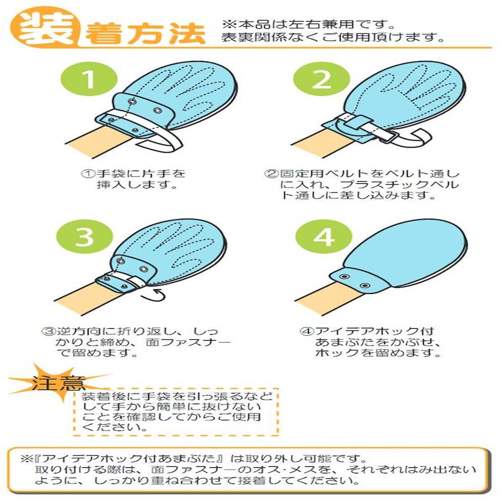 ご本人では開けにくいアイデアホックを採用。保護パッドにより,物がつかみにくい形状になっています。保護パッドは手袋の両面に入っているため,左右・裏表関係なく使用できます。手首ベルトの上からアイデアホック付あまぶた(取り外し可能)をかぶせて留めるため,使用者ご本人にはミトンを外しにくい構造になっています。手袋の中はゆったりしていて手の動きを妨げません。