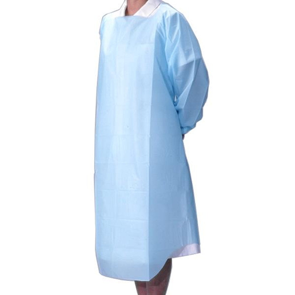 まとわりつきにくいエンボス加工。撥水性があり、まとわりつきにくいエンボス加工のビニールエプロンです。袖口はゴムになっています。 ブルー 1枚入×50袋