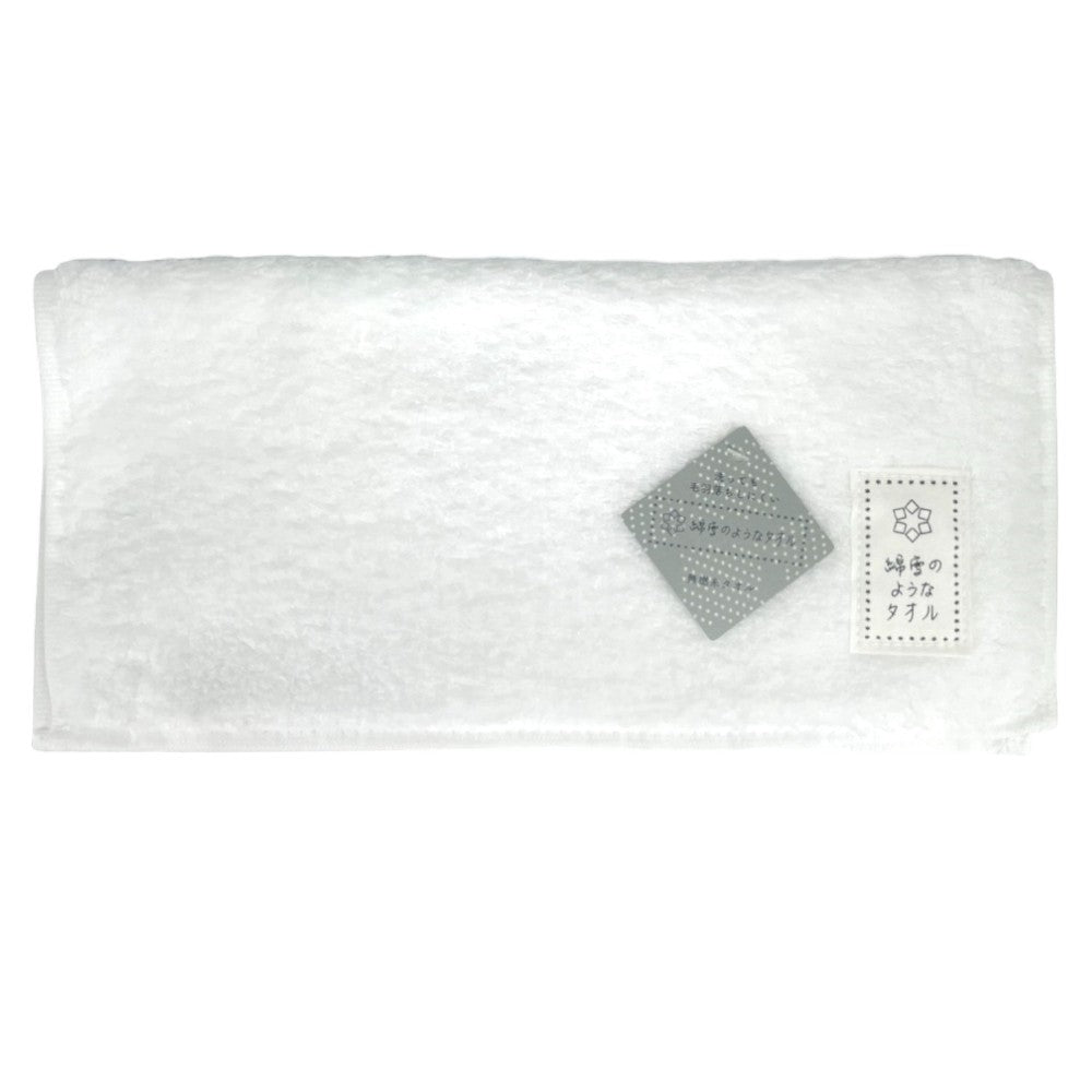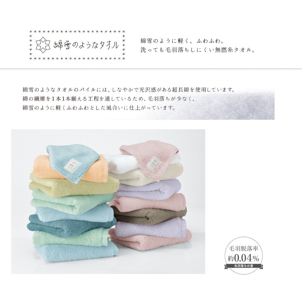 綿雪のように軽く、ふわふわ。洗っても毛羽落ちしにくいタオル。パイルには、しなやかで光沢感がある超長綿を使用しています。綿の繊維を1本3本揃える工程を通しているため、毛羽落ちが少なく、綿雪のように軽くふわふわとした風合いに仕上がっています。