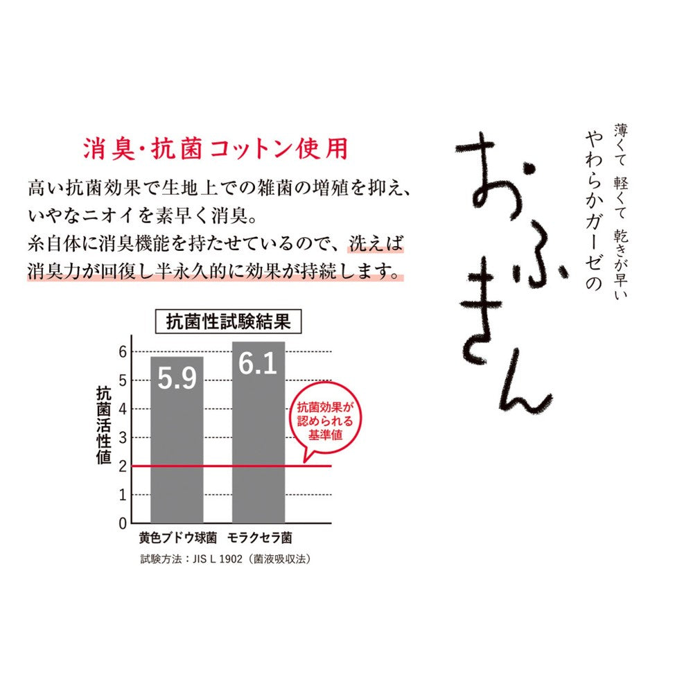 薄くて、軽くて、乾きが早いやわらかガーゼのおふきん。高い抗菌効果で生地上での雑菌の増殖を抑え、いやなニオイを素早く消臭。糸自体に消臭機能を持たせているので、洗えば消臭力が回復し半永久的に効果が持続します。