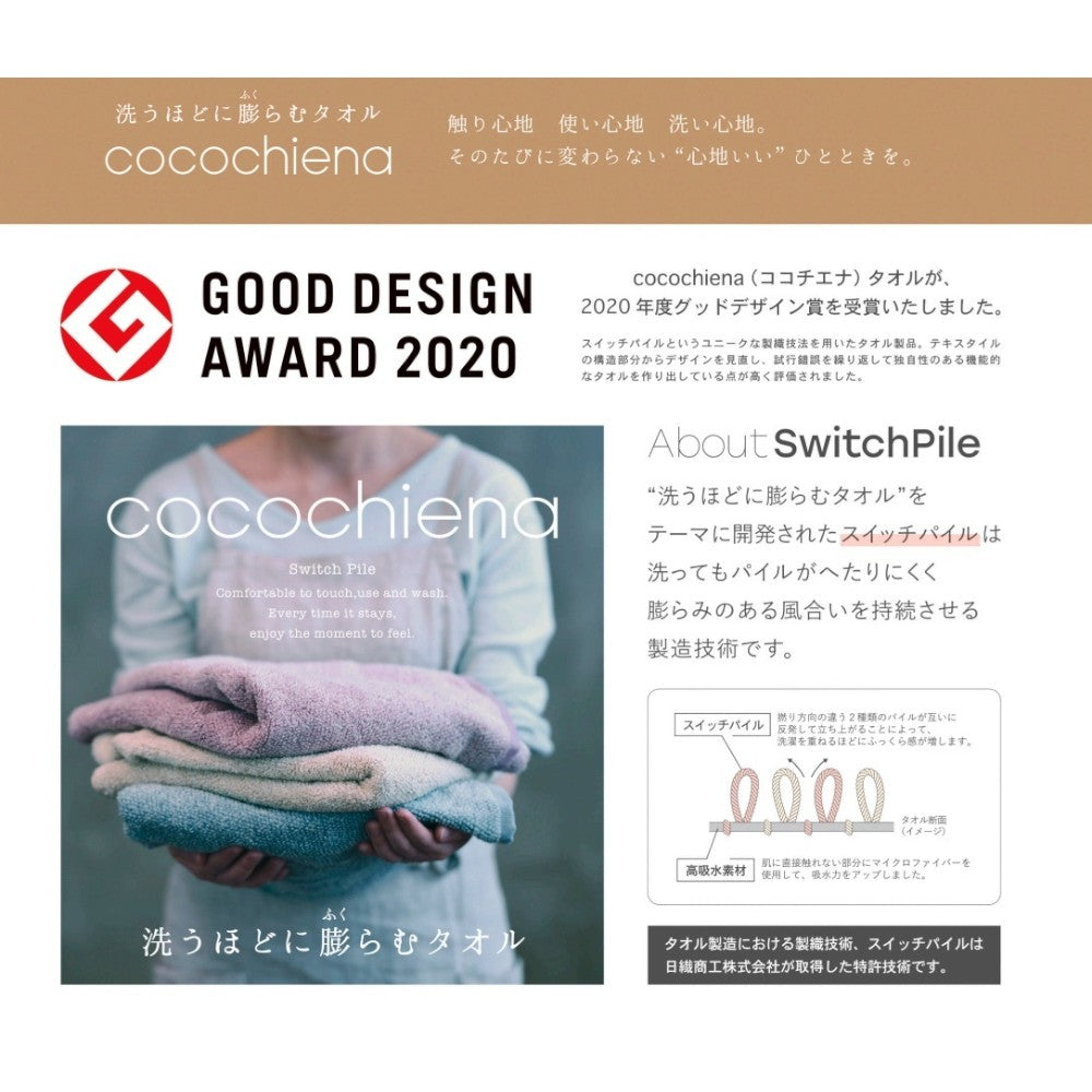 洗うほどに膨らむタオル。触り心地、使い心地、洗い心地。そのたびに変わらない「心地いい」ひとときを。「洗うほどに膨らむタオル」をテーマに開発されたスイッチパイルは洗ってもパイルがへたりにくく膨らみのある風合いを持続させる製造技術です。