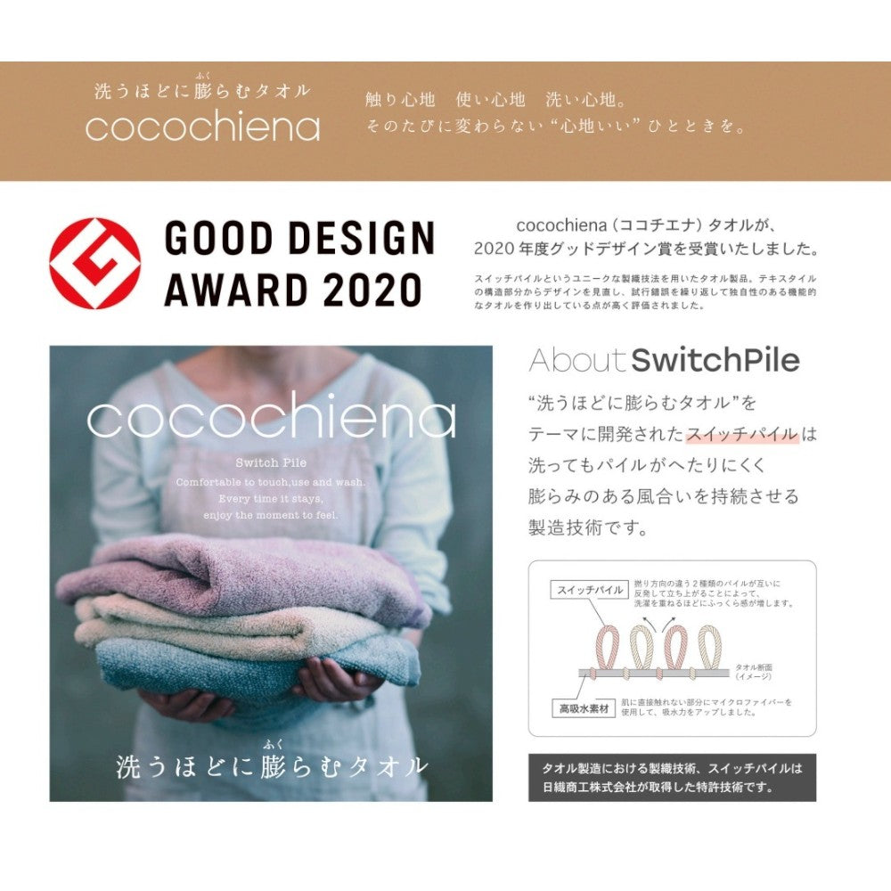 洗うほどに膨らむタオル。触り心地、使い心地、洗い心地。そのたびに変わらない「心地いい」ひとときを。「洗うほどに膨らむタオル」をテーマに開発されたスイッチパイルは洗ってもパイルがへたりにくく膨らみのある風合いを持続させる製造技術です。