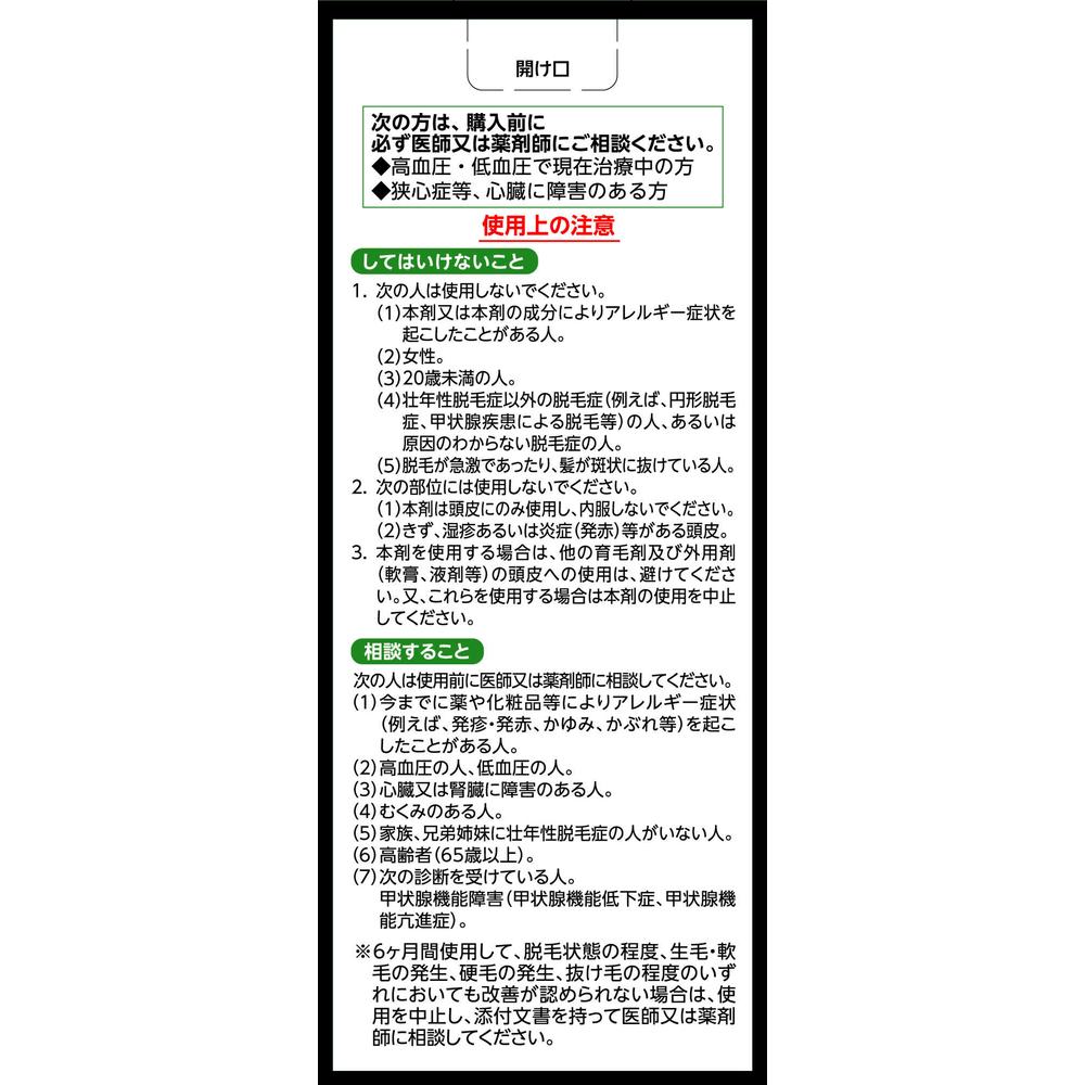 4.使用開始後6ヵ月以内であっても、脱毛状態の悪化や、次のような脱毛が見られた場合は、使用を中止し、この説明書を持って医師又は薬剤師に相談してください