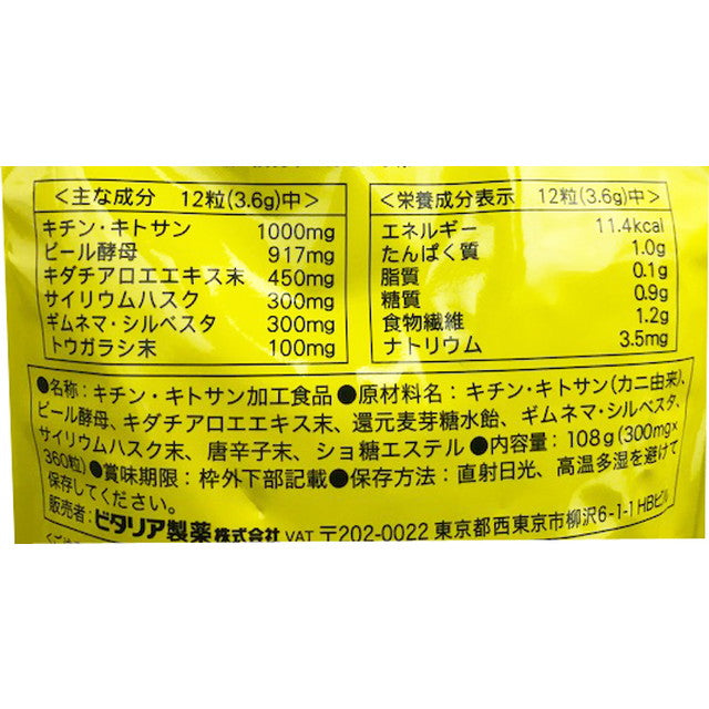 几丁质壳聚糖 1000 毫克,啤酒酵母 917 毫克,Kidachi 芦荟提取物粉末 450 毫克,洋车前子壳 300 毫克,匙羹藤 300 毫克,胡椒粉 100 毫克