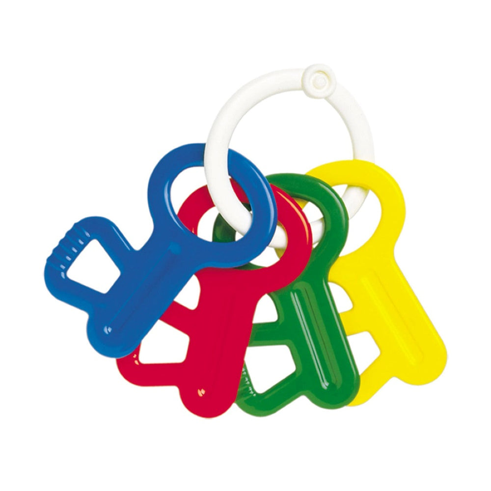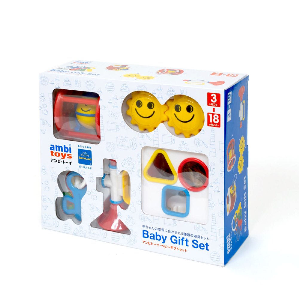 1950年代から世界中の新米ママ・パパに選ばれてきた、アンビ・トーイのベビー遊具。赤ちゃんの発達に合わせて、必要な機能がバランスよく揃ったギフトセットは、ボーネルンドのロングセラーとして多くのお客様に選ばれてきました。ファーストキー、ツイン・ラトル、ハンプティダンプティローラー、トランペット、ロックブロック、各1点ずつ