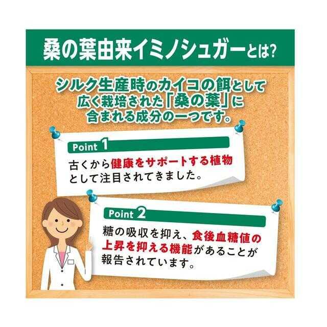 本品に含まれる桑の葉由来イミノシュガーは、糖の吸収を抑え、食後血糖値の上昇を抑える機能があることが報告されています。