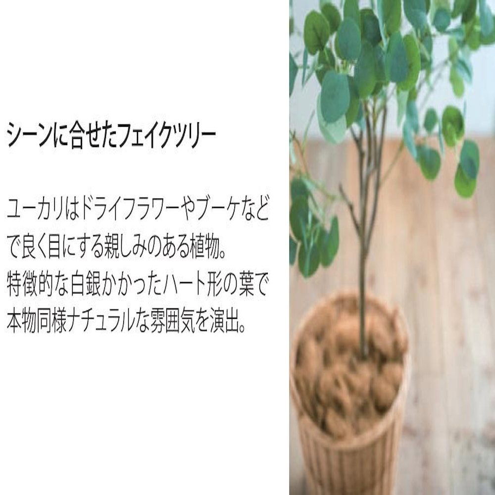 シーンに合せて使えるフェイクツリー! ユーカリはドライフラワーやブーケなどで良く目にする親しみのある植物です。特徴的な白銀かかったハート形の葉で本物同様ナチュラルな雰囲気を演出します。