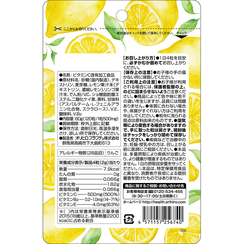 1日目安量4粒でレモン25個分のビタミンC500mgが補給できます。