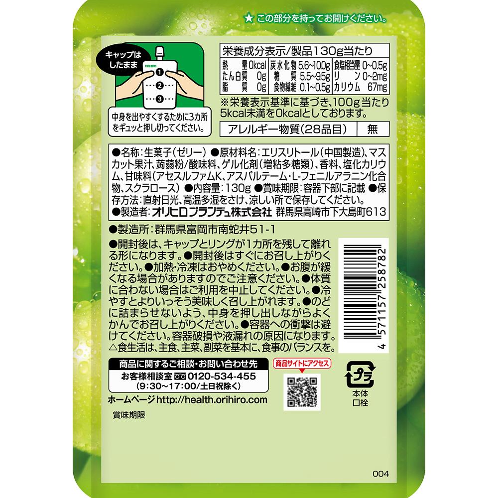 エリスリトール、マスカット果汁、蒟蒻粉/酸味料、ゲル化剤(増粘多糖類)、香料、塩化カリウム、甘味料(アセスルファムK、アスパルテーム・L‐フェニルアラニン化合物、スクラロース)